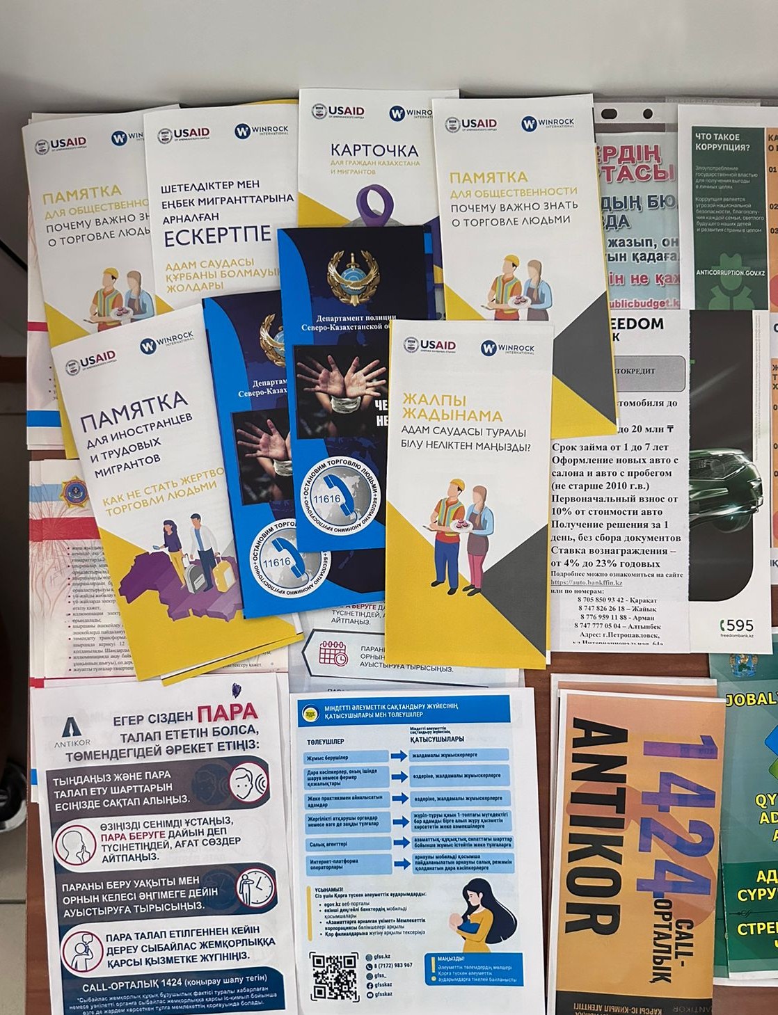Жұртшылықтың және тәуекел топтарының адам саудасы проблемасы туралы хабардарлығын арттыру жөніндегі ақпараттық-насихаттау іс-шаралары аясында әуежайларды, вокзалдарды, қоғамдық орындарды, қоғамдық тамақтану объектілерін және т. б. қоса алғанда, кіру/шығу өткізу пункттерінде материалдар (тақтайшалар, брошюралар, сенім телефондары, жедел желілер телефон нөмірлері көрсетілген буклеттер) орналастырылады.