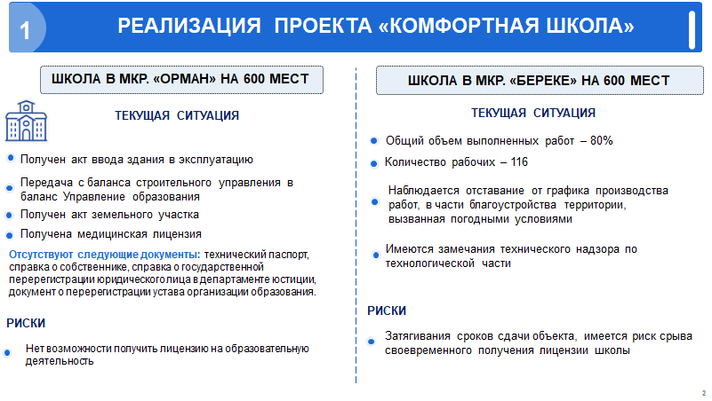 Департамент басшысы Гүлнар Темірболатқызы проблемалық мәселелерге тоқталып кетті. Жайлы мектептердің білім беру қызметіне лицензияны уақтылы алмау қаупі туралы; облыс бюджетін оңтайландыруға байланысты мектептерді жаңартудың сапасыз жүргізілуі; жекеменшік мектептерде оқулықтармен уақтылы қамтамасыз етілмеуі оқу процесінің бұзылуына әкелуі мүмкіндігі; өңірде «Білім берудегі өзгерістердің 1000 көшбасшысы» жобасының әлсіз іске асырылуы туралы.