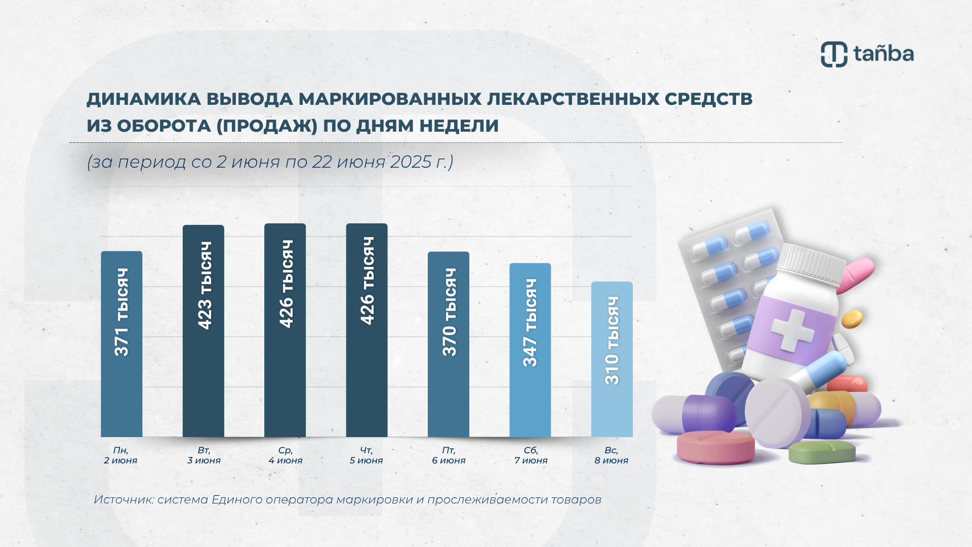 Tañba тауарларын таңбалау мен қадағалаудың бірыңғай операторлары жүйесінің мәліметтеріне сәйкес, ең үлкен сұраныс аптаның ортасында болады. Көбінесе қазақстандықтар дәрі-дәрмектерді сейсенбі мен сәрсенбіде сатып алады.