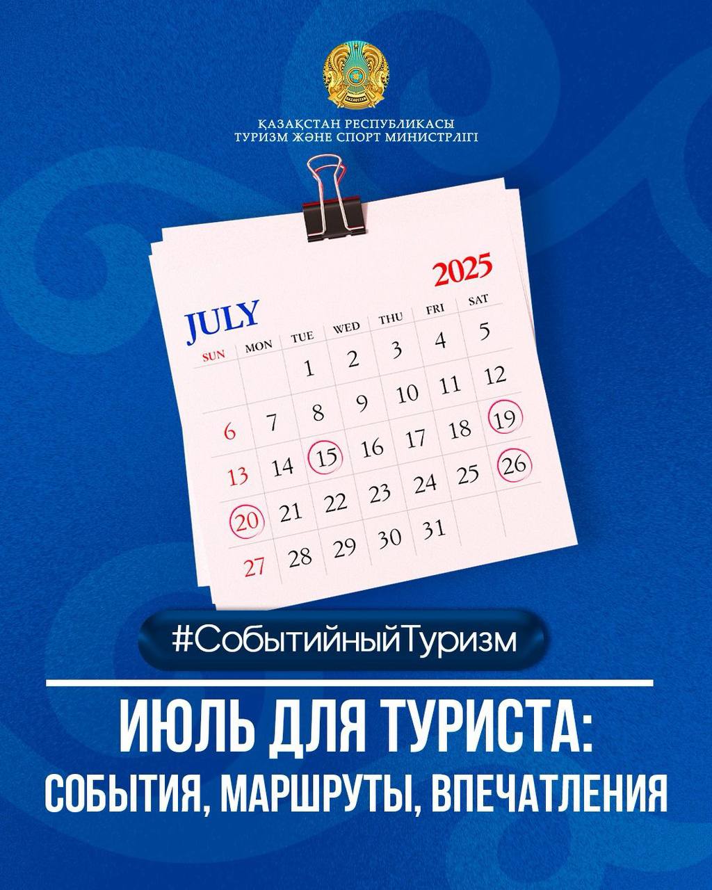 Қазақстан Республикасы Туризм және спорт министрлігі осы айға арналған ауқымды спорттық жарыстар мен мәдени-туристік іс-шаралар күнтізбесін ұсынады.