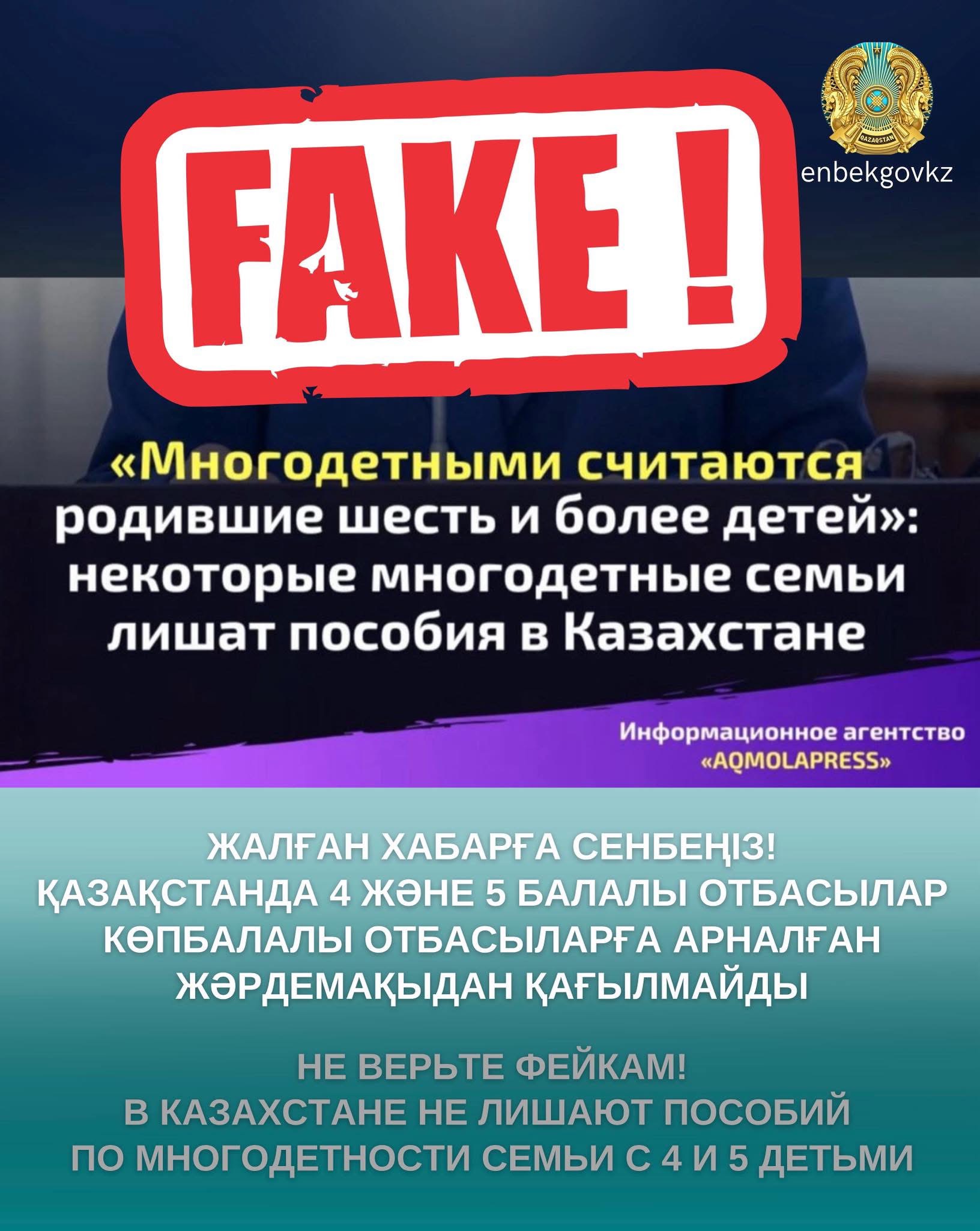 Бірқатар БАҚ, ақпараттық топтар мен әлеуметтік желі парақшаларында қолданыстағы заңнамаға сәйкес 6 және одан да көп балалы отбасылар ғана көпбалалы отбасы болып саналады деген жалған ақпараттар таралуда.