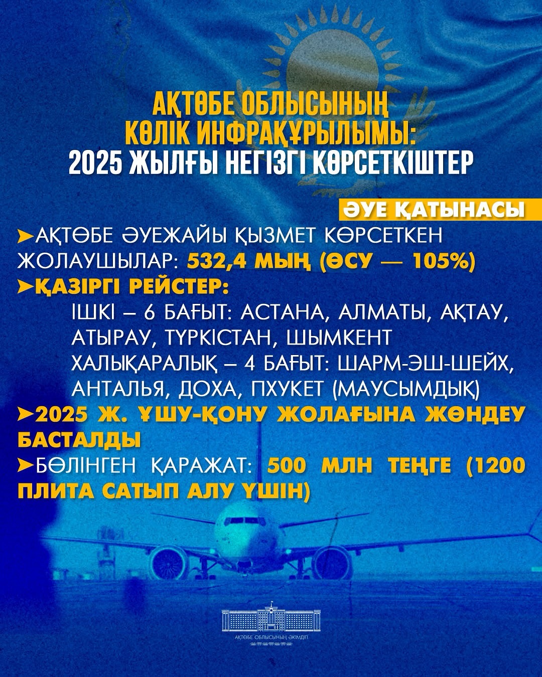 🔸Әлия Молдағұлова атындағы халықаралық әуежай 2025 жылдың алғашқы жартысында 532,4 мың жолаушыға қызмет көрсетіп, көрсеткіш 105%-ға өсті. Қазіргі таңда әуежайдан 6 ішкі және 4 халықаралық рейс орындалуда. Ұшу-қону жолағын жөндеуге 500 млн теңге бөлінді.