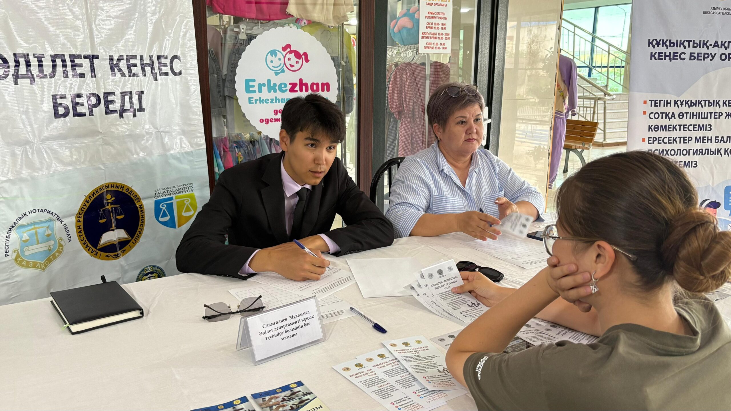 ​Ағымдағы жылдың 15 шілде күні Атырау облысы Әділет департаментінің құқықтық түсіндіру жұмысы және заңгерлік қызмет көрсету бөлімінің бас маманы М.Сламғалиев «ЗАҢ ЖӘНЕ ТӘРТІП» қағидаттары аясында тегін заң көмегін ұсыну арқылы азаматтардың құқықтық сауаттылығын арттыру және көтерілген мәселелерге жедел әрекет ету бойынша «Көктем» сауда үйінде қала тұрғындарымен қоғамдық қабылдау өткізді.