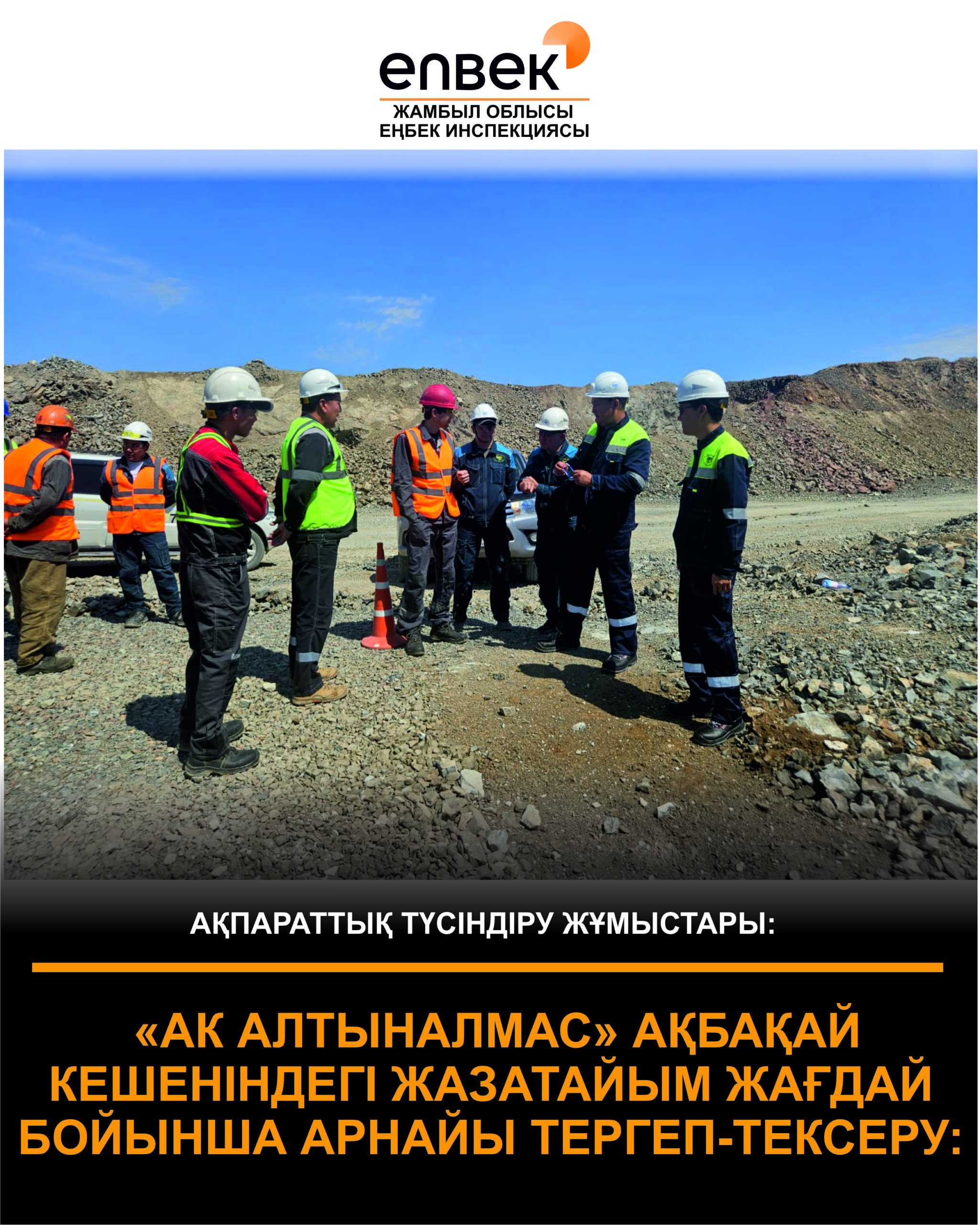 Жамбыл облысының мемлекеттік еңбек инспекторлары Ж. Қалиев пен А. Бибол 2025 жылдың 3 шілдесінде «АК Алтыналмас» АҚ-ның «Ақбақай» кен-байыту кешенінің «Кенжем» карьерінде «АА Mining» ЖШС-нің слесарь-жөндеушісі Жамбылов Аян Махмутказиевичпен орын алған жазатайым оқиғаға байланысты арнайы тергеп-тексеру жұмыстарын жүргізді.