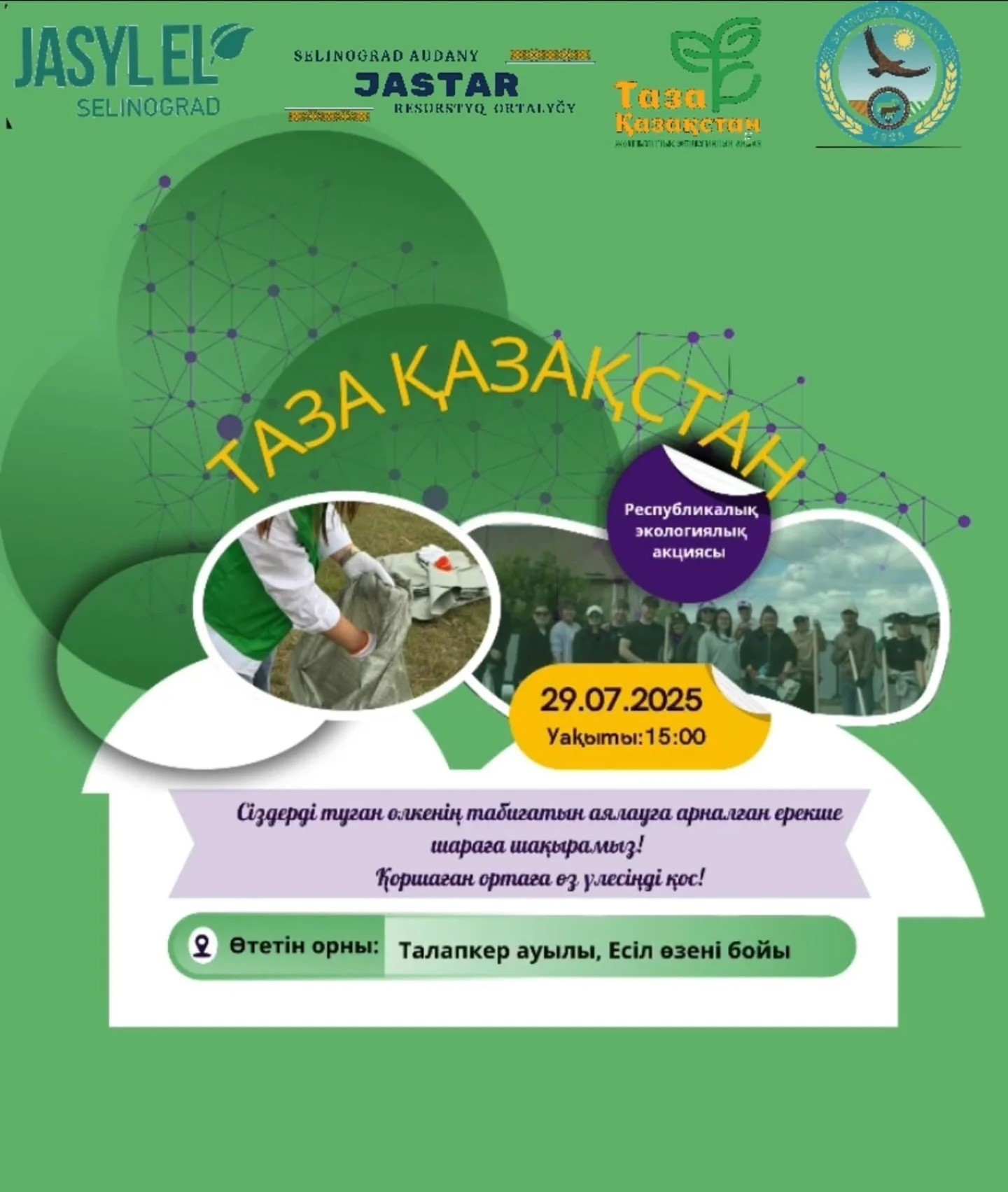 Сіздерді 29 шілде күні өтетін республикалық экологиялық акция – «Таза Қазақстан – Таза болашақ» атты сенбілікке шақырамыз!