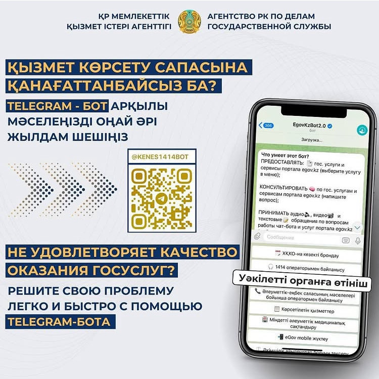 Мемлекеттік қызмет істері агенттігімен халықтың мемлекеттік қызметтер көрсету жөніндегі шағымдары мен ұсыныстарына жедел ден қою мақсатында «Электрондық үкімет» веб-порталының мәселелері бойынша Telegram мобильдік қосымшасында «EgovKzBot2.0» ресми бот-платформасы арқылы «Уәкілетті органға жүгіну» түймесі іске қосылды.