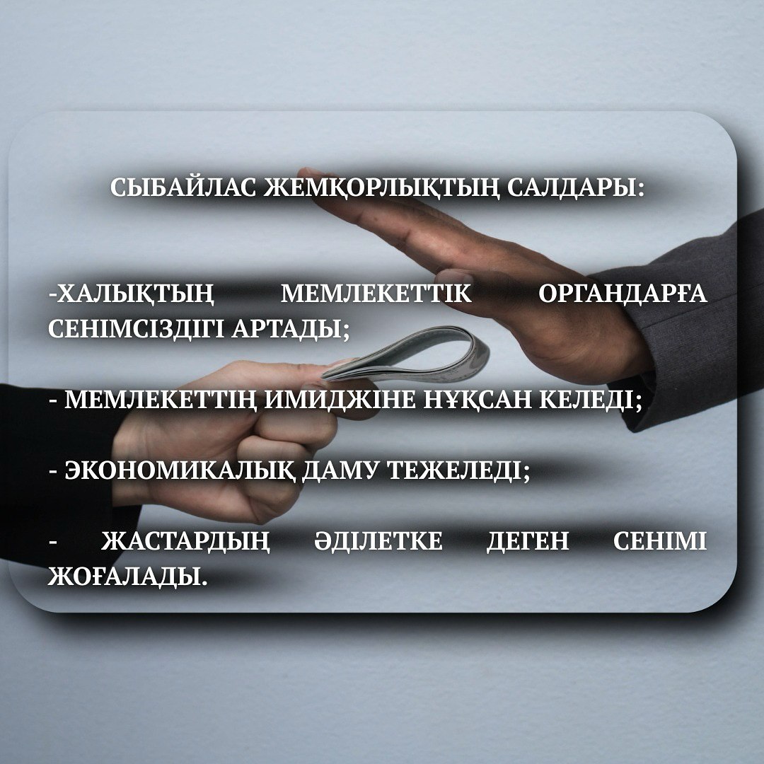 Бұл инфографикада сіз сыбайлас жемқорлықтың салдары, және одан қорғану жолдары туралы маңызды ақпаратпен таныса аласыз.