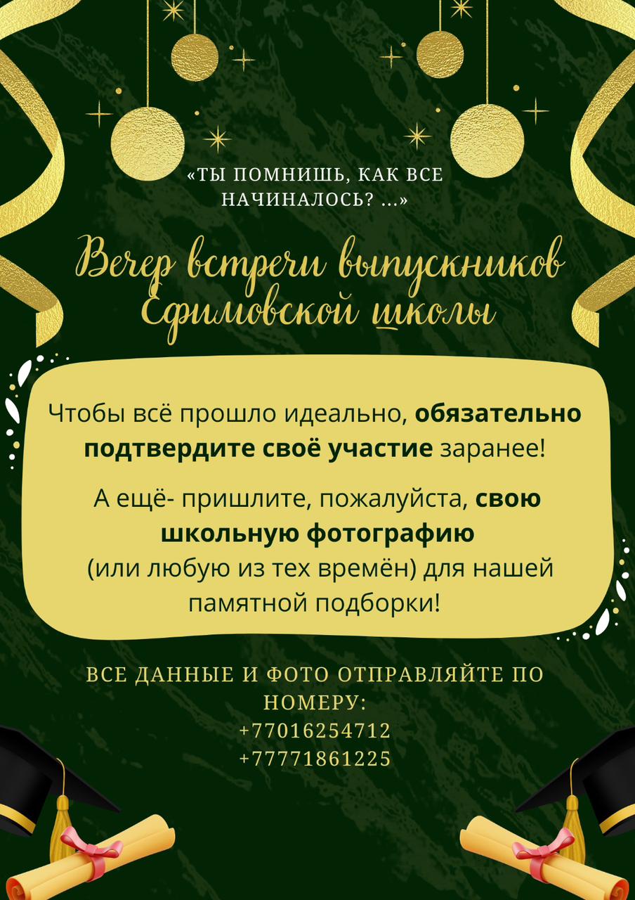 16 тамызда Ефимовская негізгі мектебінің қабырғасында көптен күткен түлектердің кездесуі өтеді. Бұл мектеп жылдарындағы атмосфераға тағы бір рет енуге, сыныптастармен кездесуге, сүйікті мұғалімдермен сөйлесуге және мектеп өмірінің жарқын сәттерін есте сақтауға тамаша мүмкіндік.