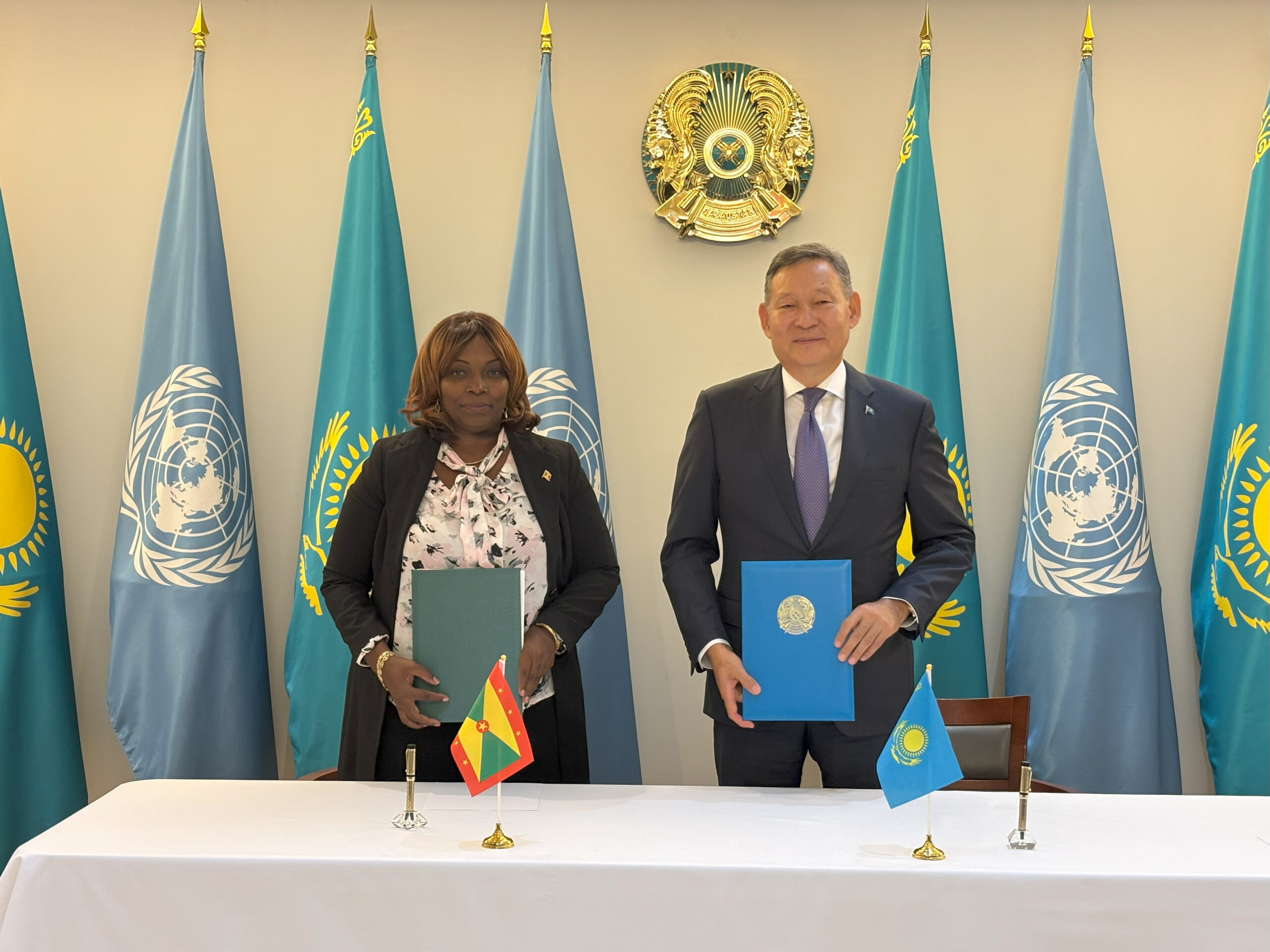 Нью-Йорк, 2025 жылғы 18 тамыз – Қазақстан Республикасының БҰҰ жанындағы Тұрақты Өкілі Қайрат Омаров және Гренаданың БҰҰ жанындағы Тұрақты Өкілі Ингрид Джексон Қазақстан Республикасының Үкіметі мен Гренада Үкіметі арасындағы дипломатиялық және қызметтік/ресми паспорттардың иелері үшін визалық талаптардан өзара босату туралы келісімге қол қойды.