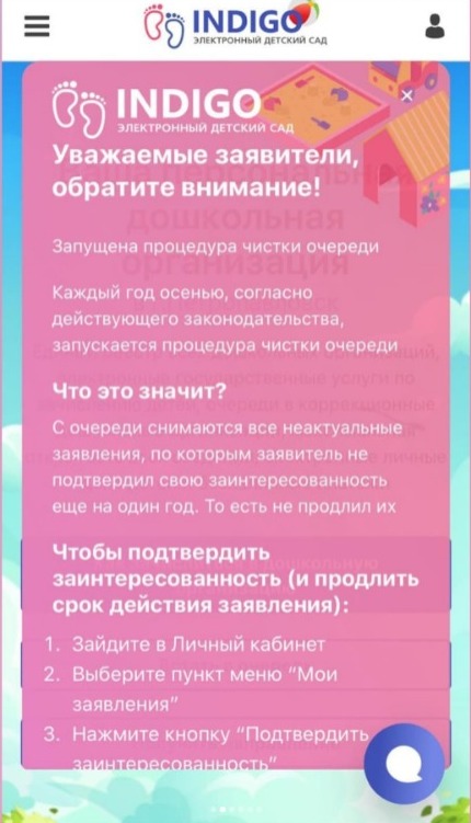 Қарағанды облысы білім басқармасының «Шахтинск қаласының білім бөлімі» ММ мектепке дейінгі жастағы балалардың кезектілік тізімін жыл сайын жаңарту мақсатында (“INDIGO: электрондық балабақша” АЖ) сіздің назарыңызға жеткізеді indigo24.kz.) 3 жастан 6 жасқа дейінгі балалардың кезектілігін 12 айда бір рет міндетті түрде растауды көздейді. Егер ата-ана кезекті растамаса, онда ол өз кезегін жоғалтады және «тоқтату» парағына түседі. Өтініштің қолданылу мерзімін ұзарту үшін сізге 2025 жылғы 2 қыркүйектен 15 қыркүйекке дейінгі аралығында: