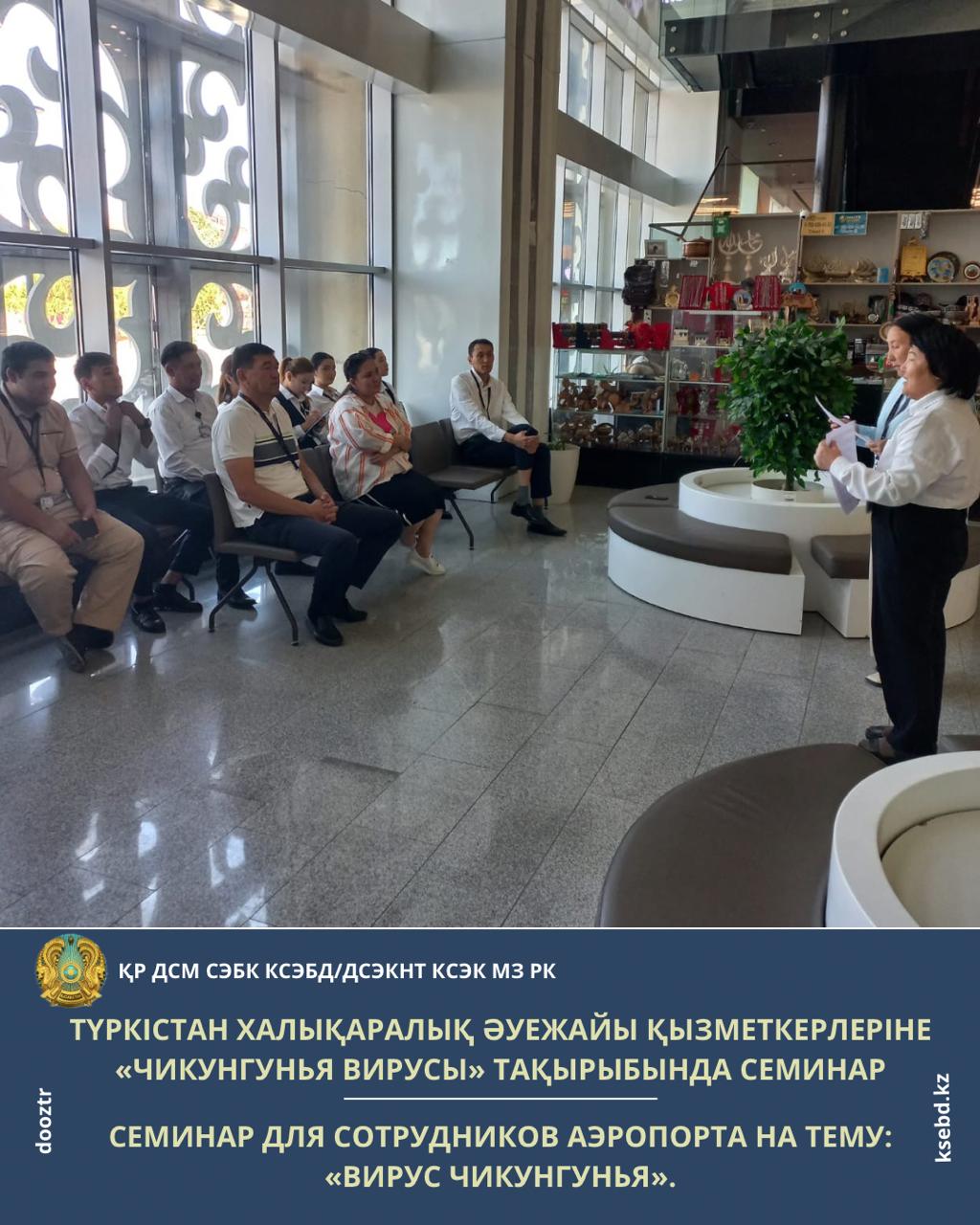 28 тамыз 2025 жылы Түркістан халықаралық әуежайында Астана қаласы санитариялық-карантиндік бақылау бөлімінің Түркістан қаласы мамандары әуежай қызметкерлерімен «Чикунгунья вирусы: клиникалық көрінісі және алдын алу шаралары» тақырыбында семинар өткізді.