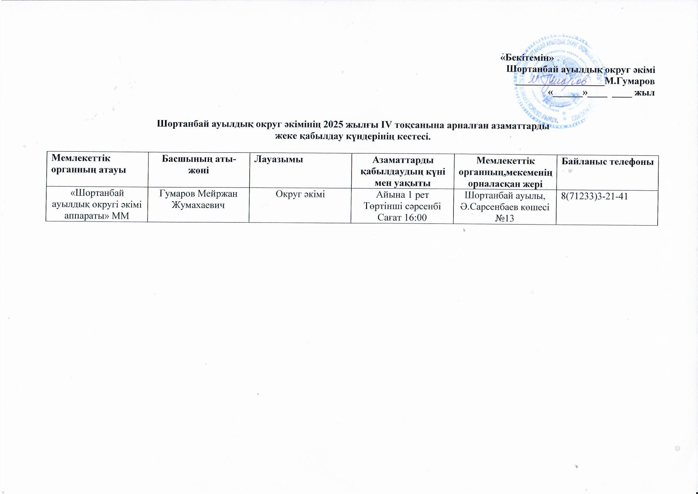 Шортанбай ауылдық округ әкімінің 2025 жылғы ІV тоқсанына арналған азаматтарды жеке қабылдау күндерінің кестесі