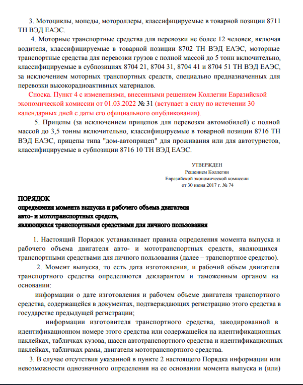 Хабарлаймыз, жеке пайдалануға арналған авто және мотокөлік құралдары мен тіркемелер тізбесі Еуразиялық экономикалық комиссия Алқасының 2017 жылғы 30 маусымдағы №74 шешімімен айқындалған.