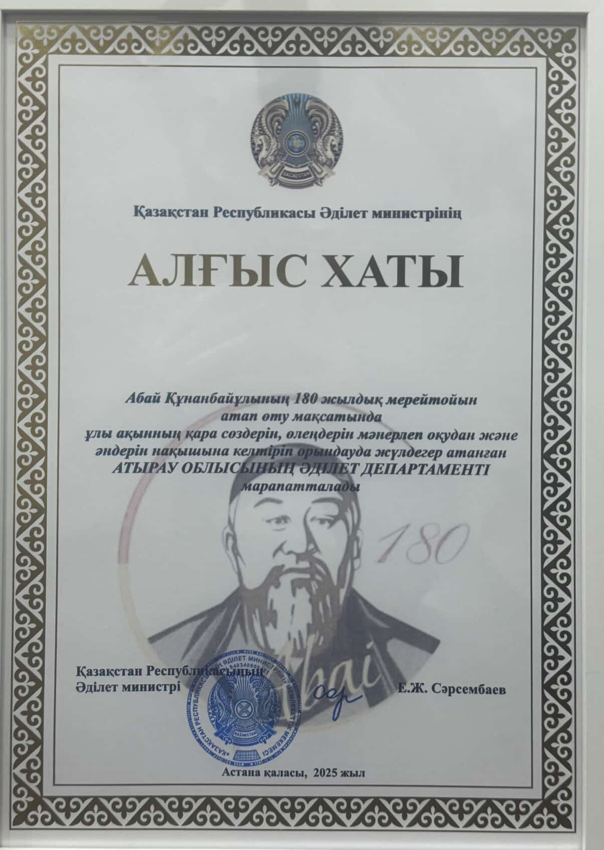 Абай Құнанбайұлының 180 жылдық мерейтойына орай ұйымдастырылған байқауда Атырау облысы Әділет департаменті Алғыс хатпен марапатталды.