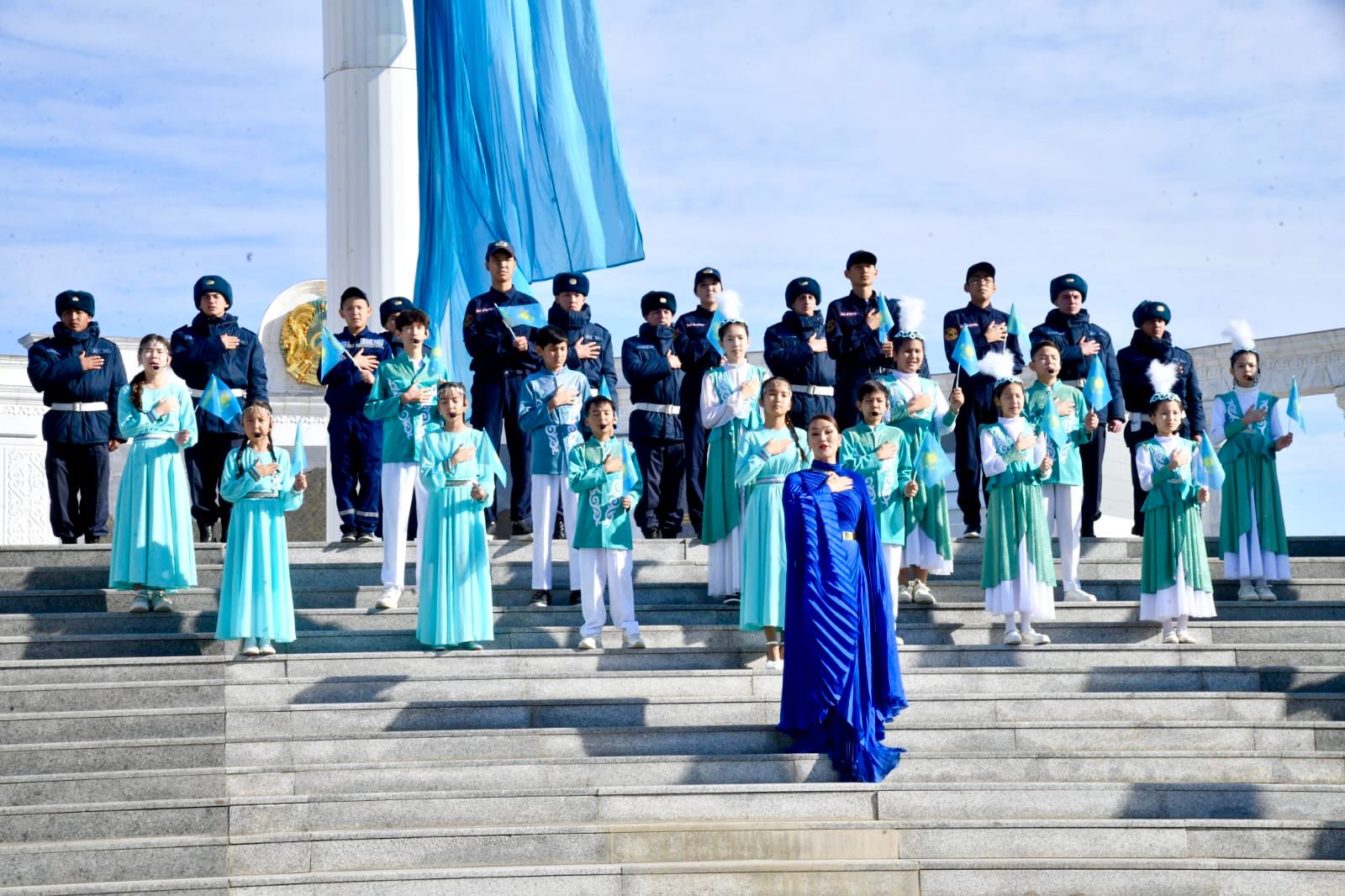Салтанатты жиында Мемлекеттік Гимн орындалып, биіктігі 91 метр болатын тұғырға көк байрағымыз көтерілді.