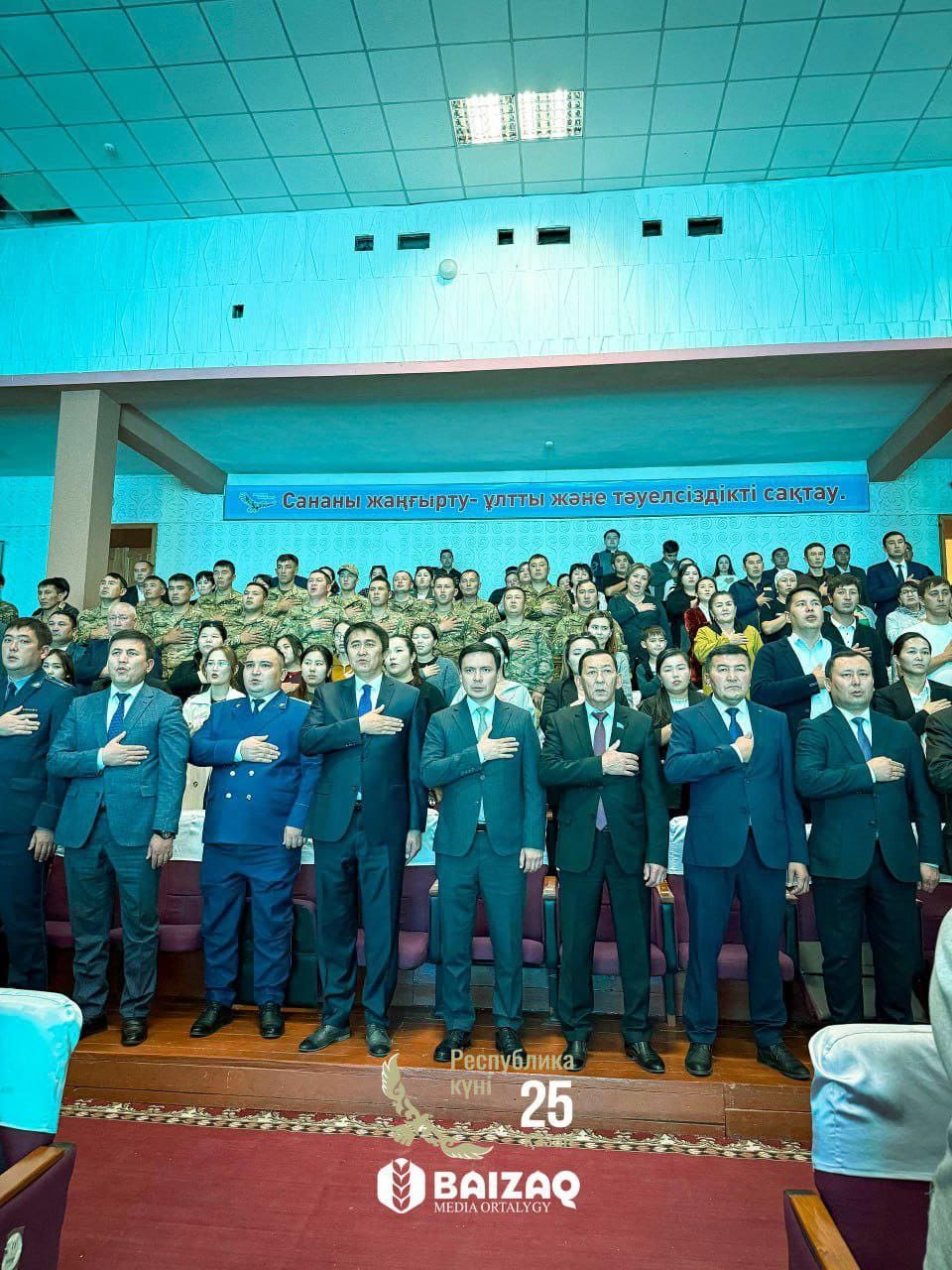 Бүгін аудандық әл-Фараби атындағы мәдениет үйінде Республика күніне орай салтанатты жиын өтті. Алдымен сахна төріне мемлекеттік Ту шығарылып, мемлекеттік Гимн орындалды.