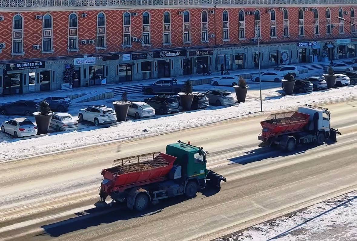Жол қауіпсіздігін қамтамасыз ету үшін жолдарға тұз аралас құм себілуде. Бұл шаралар көлік жүргізушілері мен жаяу жүргіншілердің қауіпсіз қозғалысына бағытталған.