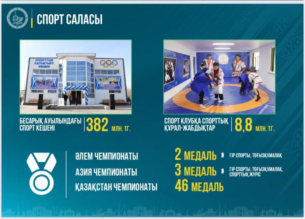 Өткен жылы облыстық бюджеттен бөлінген 382 млн теңгеге Бесарық ауылында жаңа спорт кешені пайдалануға берілді. Сонымен қатар, Президент бастамасымен құрылған «Қазақстан Халқына» қоры арқылы Айдарлы ауылындағы спорт клубы 8,8 млн теңгеге спорттық құрал-жабдықтармен қамтамасыз етілді. Осындай спортты дамыту бойынша қабылданған шаралар аясында ауданда спортпен тұрақты айналысушылардың үлесі 44,4 пайызға жетті. Аталған жұмыстар спорт инфрақұрылымын дамытуға, халықты салауатты өмір салтын ұстануға және ауданымыздың спорттық әлеуетін арттыруға бағытталған, – деді Берік Әбдіғаппарұлы.