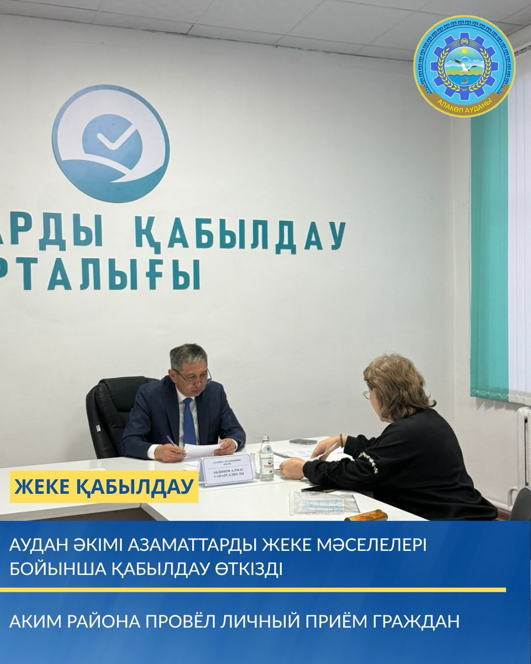 02.02.2026 күні аудан әкімі Алмас Абдинов аудан тұрғындарын жеке мәселелері бойынша қабылдау өткізді. Қабылдау барысында 12 азаматтың өтініштері тыңдалды, оның ішінде 1 азамат онлайн форматта қатысты.