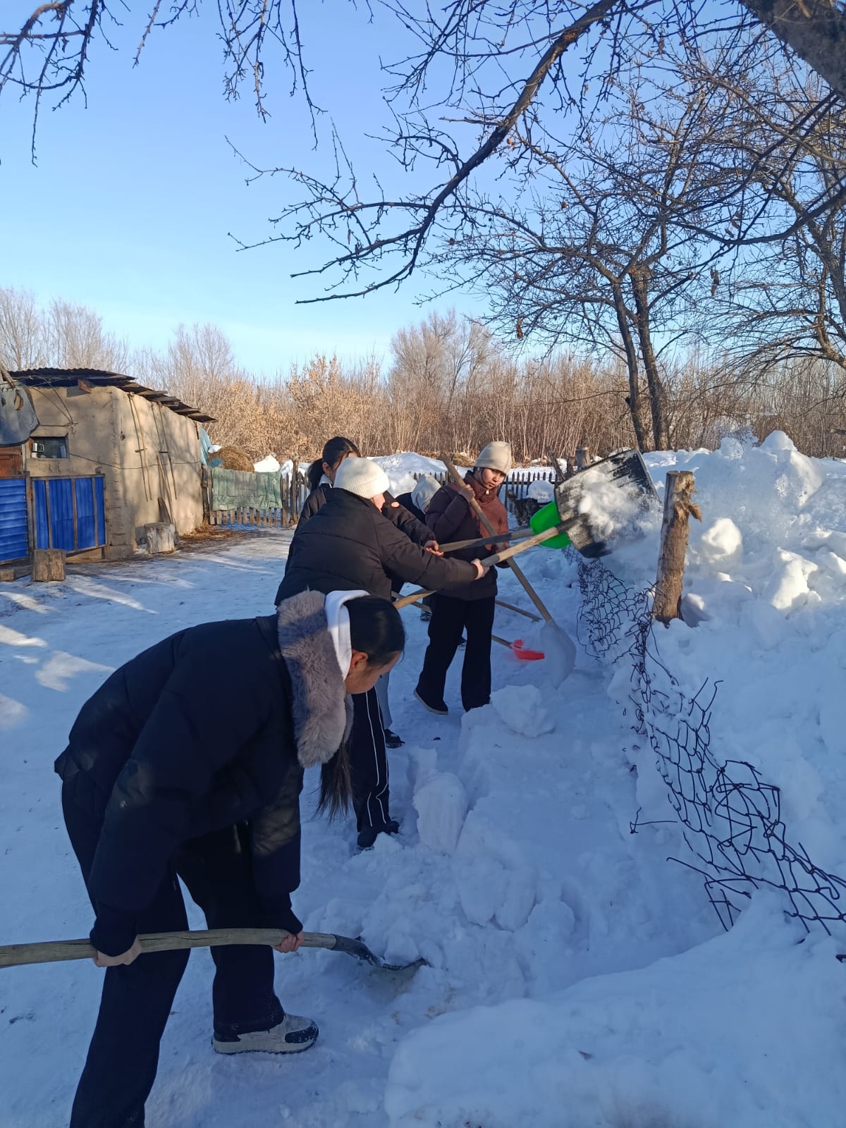Мектептегі АӘД пәнінің мұғалімі 10-сынып оқушыларымен бірге ауылымыздың қарттарына көмек көрсетіп оқушылар қарттардың үйлерінің маңындағы жолдарды кеңейтіп, қар күреп баталарын алды. Бұл игі іс үлкендерге үлкен қуаныш сыйлап, оқушыларды еңбекке, адамгершілікке тәрбиелеуге үлес қосты. Осындай шаралар жас ұрпақты мейірімділікке, жауапкершілікке баулиды.