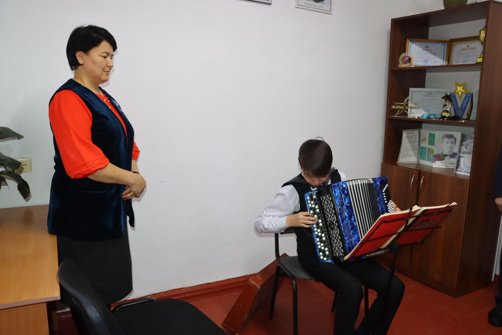 Аудан әкімі Берік Сәрменбаев аудандық мәслихат төрағасы Ержан Әжікенов және аудандық мәслихат депутаты Алмас Есназармен бірге аудандық әуез мектебінің жұмысымен танысты.