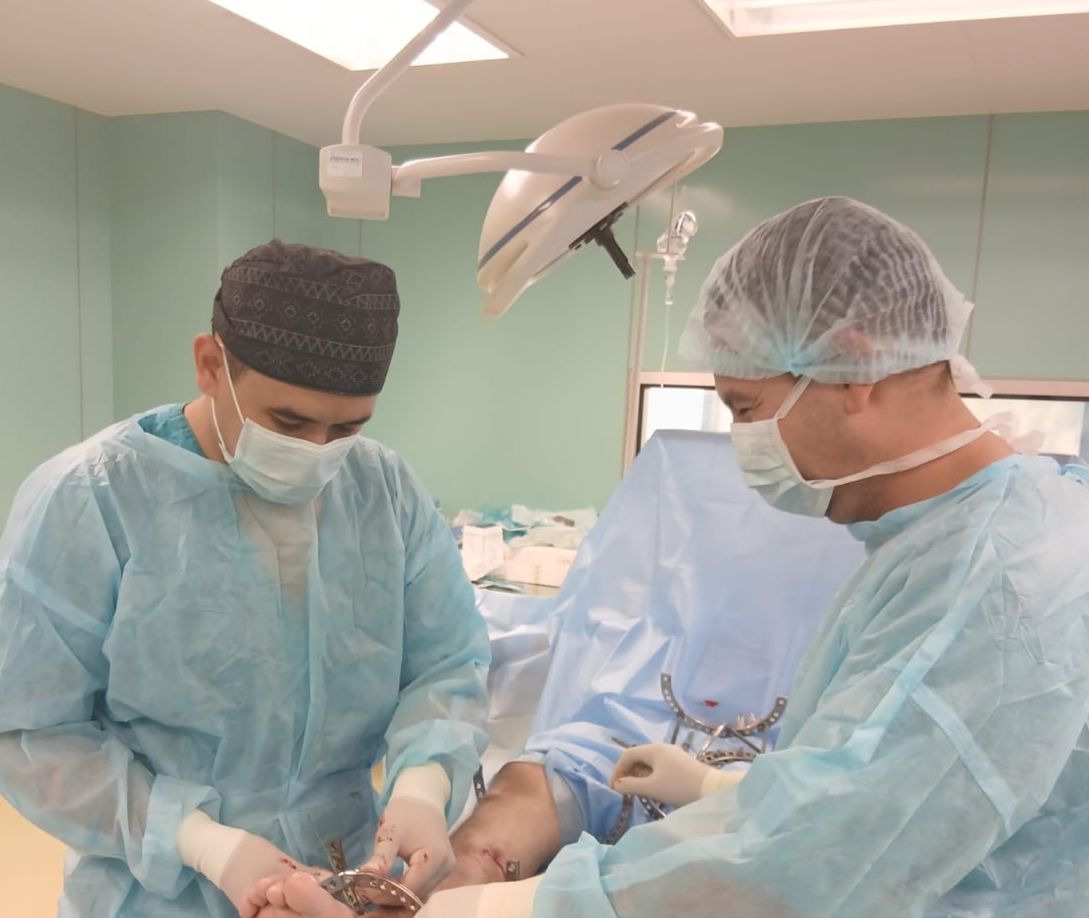 Ота екі кезеңде жүргізілді. Алдымен хирург мамандар жараны мұқият тазалап, тіршілікке қабілетсіз тінді алып тастап, жұмсақ тінге пластика жасады. Кейін сүйекке Илизаров аппараты арқылы сүйекаралық остеосинтез жүргізілді. Бұл құрылғы сүйекті берік бекітіп, олардың дұрыс әрі сапалы бітуіне жағдай жасайды. Ота 2 сағат 45 минутқа созылды.