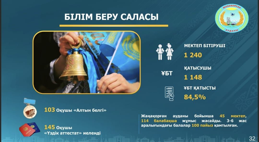 Ауданымыздағы білім беру саласы айрықша назарымызда. Білім беру ұйымдарының материалдық – техникалық базасы жаңартылуда. Апатты жағдайдағы немесе үш ауысымдағы мектептер мәселелесі толық шешілген.