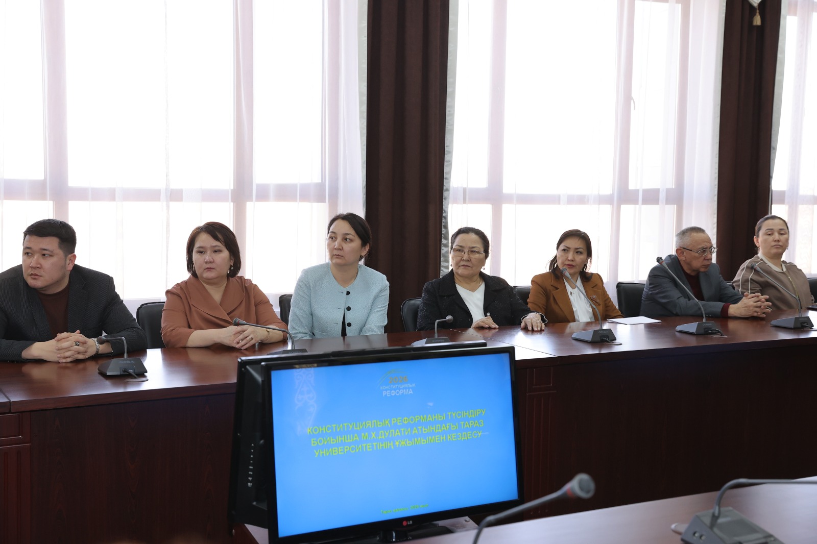 Жамбыл облысының әкімі Ербол Қарашөкеев Қазақстан Республикасы Конституциясының жаңа жобасын жан-жақты талқылау үшін М.Х. Дулати атындағы Тараз университетінің профессор-оқытушы құрамымен кездесті.
