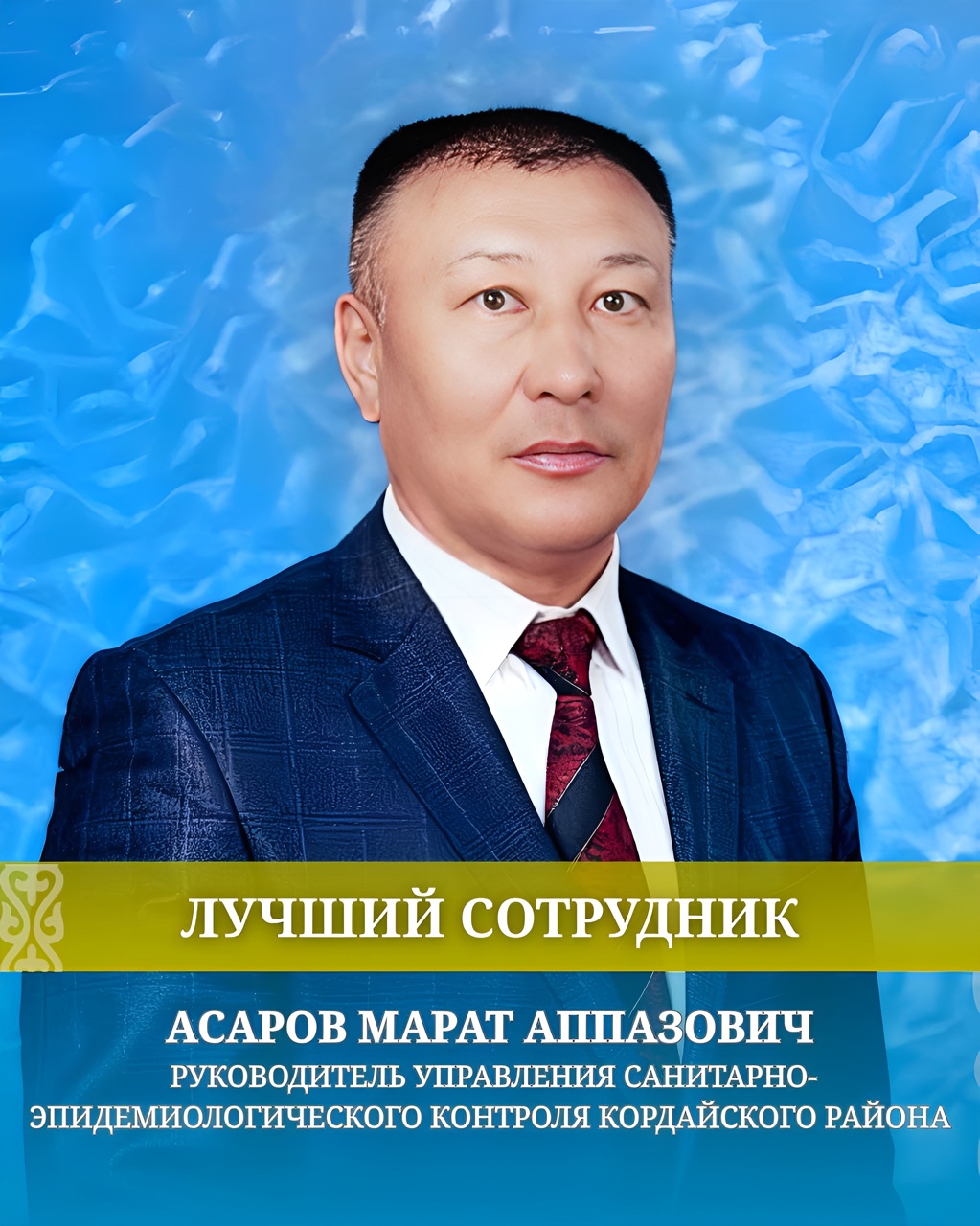 Асаров Марат Аппазұлы мемлекеттік қызметтің абыройын сақтауға, заң талаптарының бұлжытпай орындалуына және халық денсаулығын қорғау ісіне адал қызмет атқаруда. Іскерлігі, мол тәжірибесі, адамгершілік қасиеттері мен кәсіби шеберлігі арқылы ұжым ішінде зор беделге ие, жас мамандарға үлгі боларлық тәжірибелі басшы болып табылады. Осыған байланысты Асаров Марат Аппазұлы сала дамуына қосып отырған елеулі үлесі мен адал қызметі үшін үлгілі қызметкер ретінде жоғары бағаланып, үлгілі қызметкер ретінде жоғары бағалауға лайық.