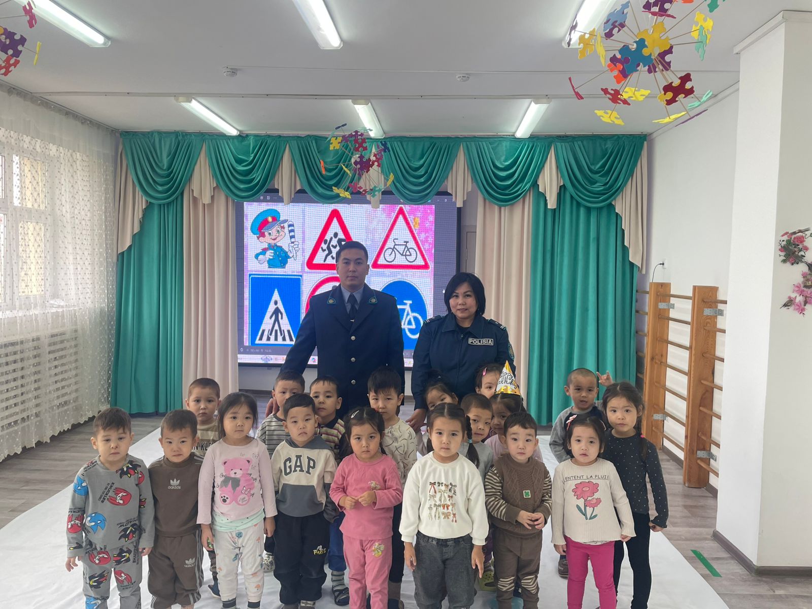Іс-шара барысында балалармен «Жол қозғалысы» тақырыбында танымдық әңгіме жүргізіліп, жолда өзін қауіпсіз ұстау ережелері қарапайым әрі түсінікті тілмен түсіндірілді. Полиция қызметкерлері жаяу жүргіншілер өткелінен өту тәртібі, бағдаршам белгілерінің мәні, жол белгілерінің маңыздылығы туралы айтып өтті. Сонымен қатар көшеден өту кезінде ересектердің көмегіне жүгіну, ойын барысында жолға жақын бармау қажеттігі ерекше атап өтілді.