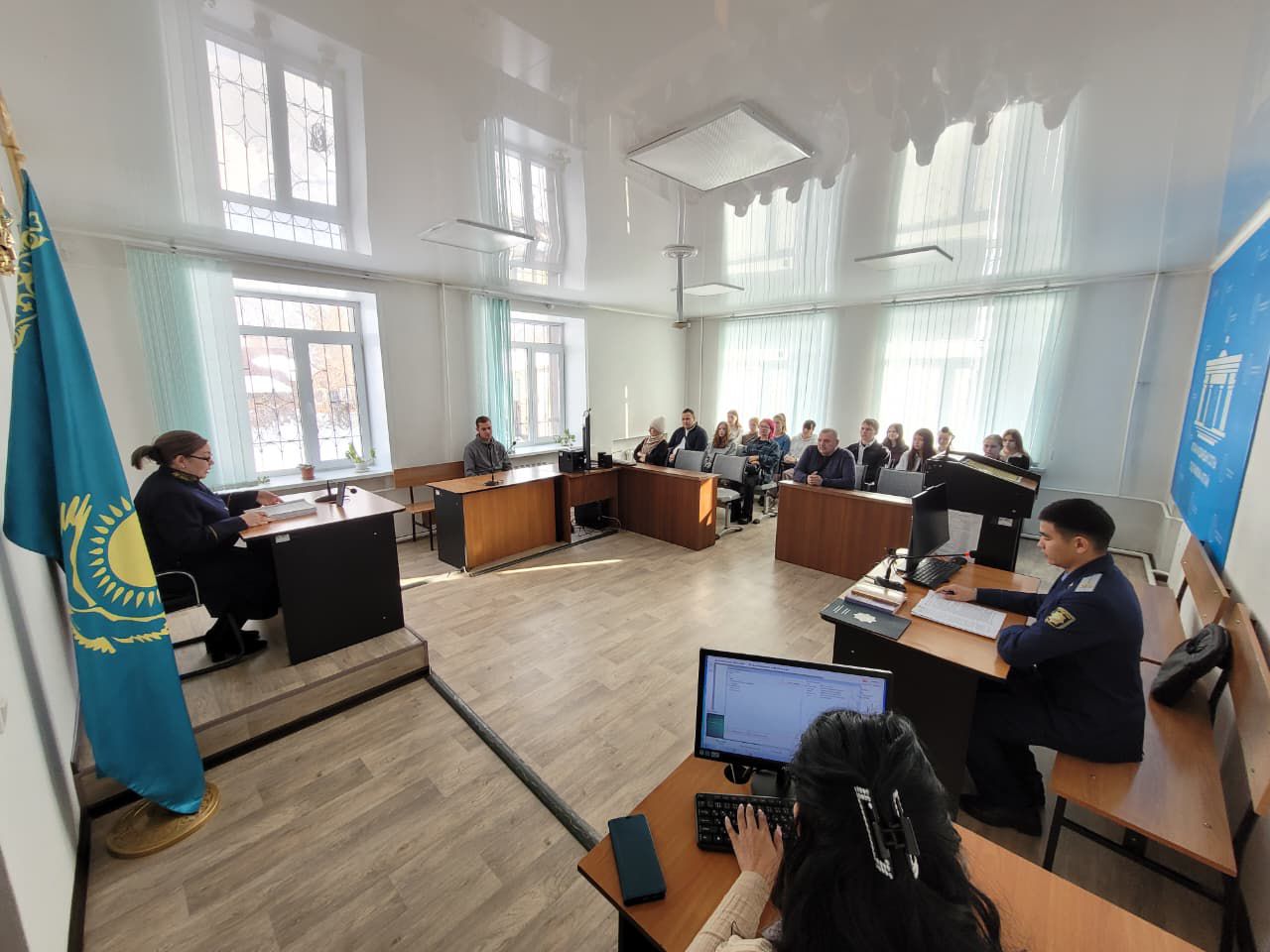 Көрсетілімдік сот процесі барысында студенттерге нақты мысал арқылы сот ісін қарау тәртібі, соттың және сот процесіне қатысушылардың рөлі, сондай-ақ құқық бұзушылық жасағаны үшін жауапкершіліктің бұлтартпастығы түсіндірілді.