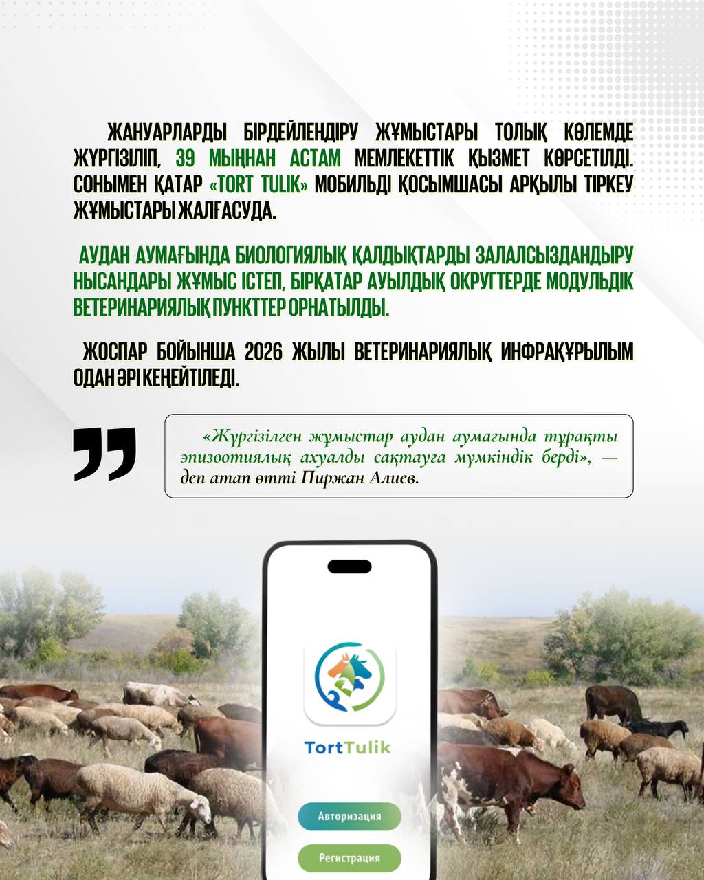 Жануарларды бірдейлендіру жұмыстары толық көлемде жүргізіліп, 39 мыңнан астам мемлекеттік қызмет көрсетілді. Сонымен қатар «Tort Tulik» мобильді қосымшасы арқылы тіркеу жұмыстары жалғасуда.
