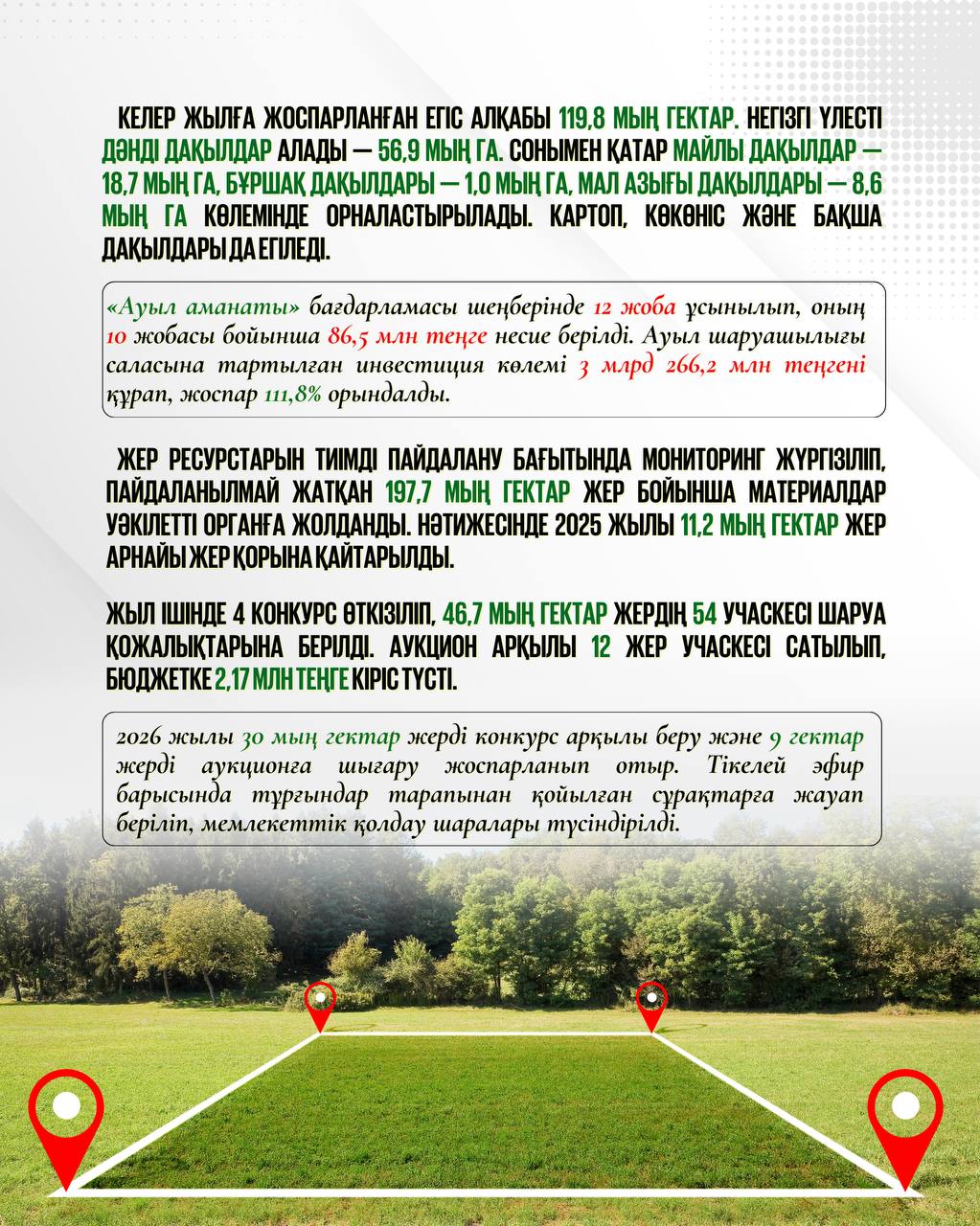 2026 жылы 30 мың гектар жерді конкурс арқылы беру және 9 гектар жерді аукционға шығару жоспарланып отыр. Тікелей эфир барысында тұрғындар тарапынан қойылған сұрақтарға жауап беріліп, мемлекеттік қолдау шаралары түсіндірілді.
