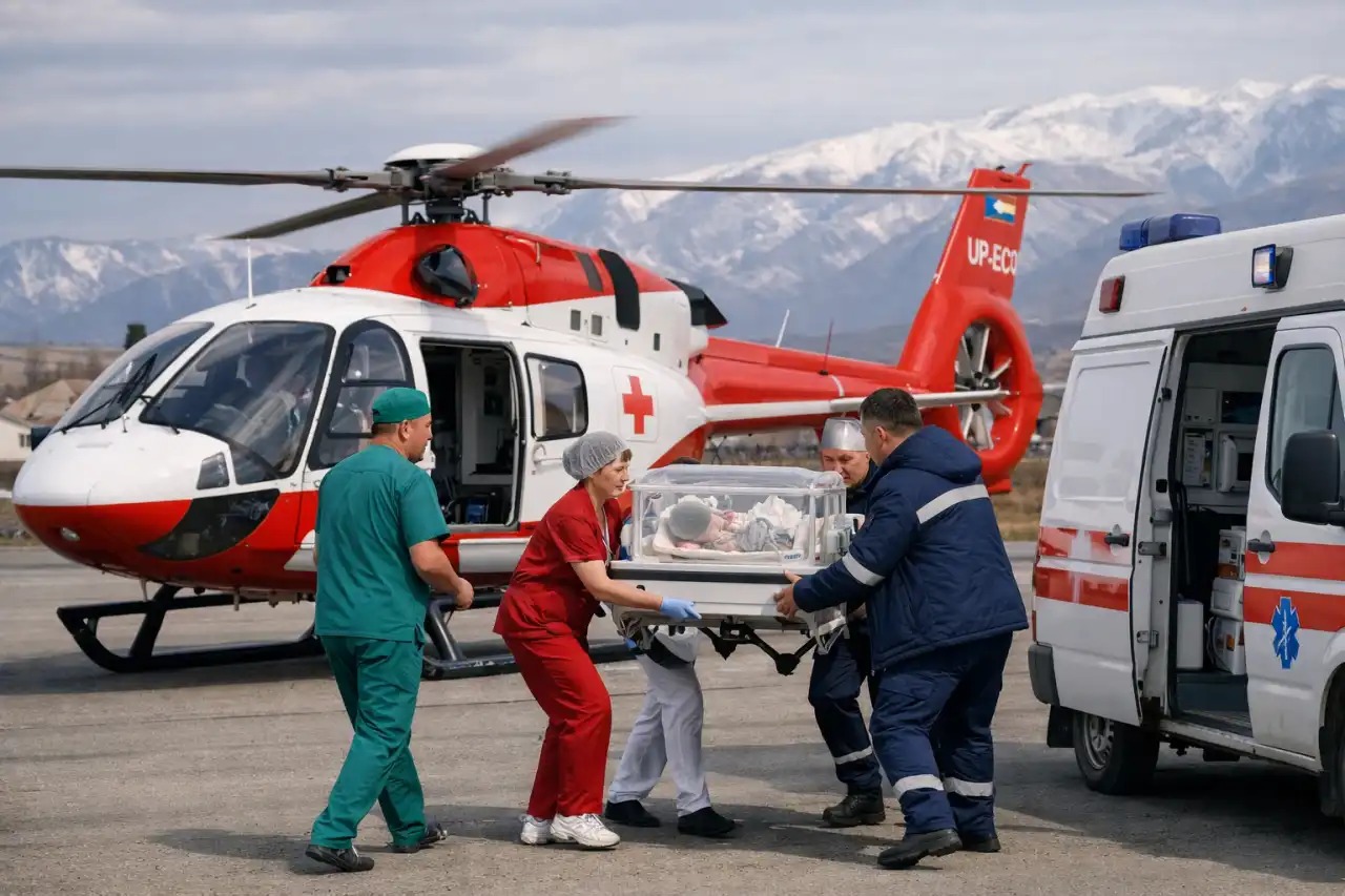Тасымалдау кезінде санитарлық авиация бригадасының құрамында тәжірибелі дәрігерлер мен фельдшерлер болып, ұшу барысында баланың жағдайы тұрақты бақылауда ұсталды. Бұл тәсіл уақыт жоғалтпай, науқасты қысқа мерзімде қажетті медициналық көмек көрсетілетін орталыққа жеткізуге мүмкіндік берді.