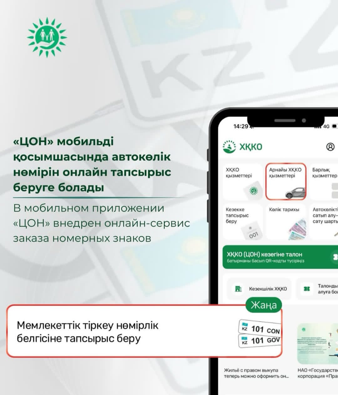 «Азаматтарға арналған үкімет» Мемлекеттік корпорациясы «ЦОН» мобильді қосымшасында жаңа цифрлық қызмет іске қосылғанын хабарлады. Енді қазақстандықтар автокөлікке арналған мемлекеттік нөмірді онлайн таңдап, тапсырыс бере алады.