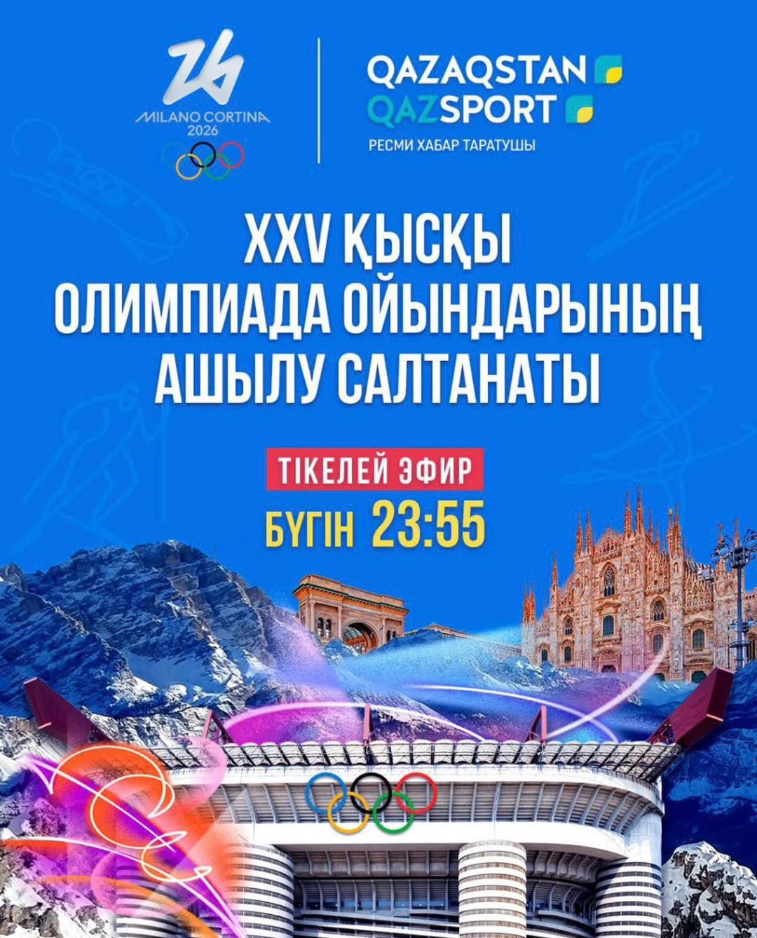 ✅Ашылу салтанатын «Qazaqstan» арнасында Ерсін Ерікұлы мен Лилиана Әлжанова, «Qazsport» арнасында Есей Жеңісұлы мен Сергей Райлян жүргізеді.