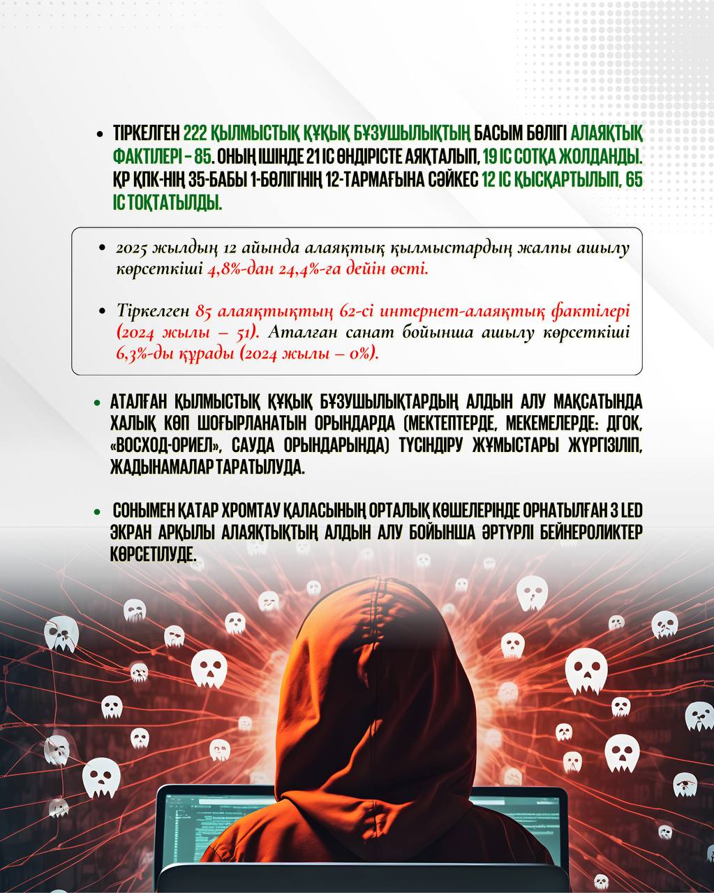 Тіркелген 85 алаяқтықтың 62-сі интернет-алаяқтық фактілері (2024 жылы – 51). Аталған санат бойынша ашылу көрсеткіші 6,3%-ды құрады (2024 жылы – 0%).