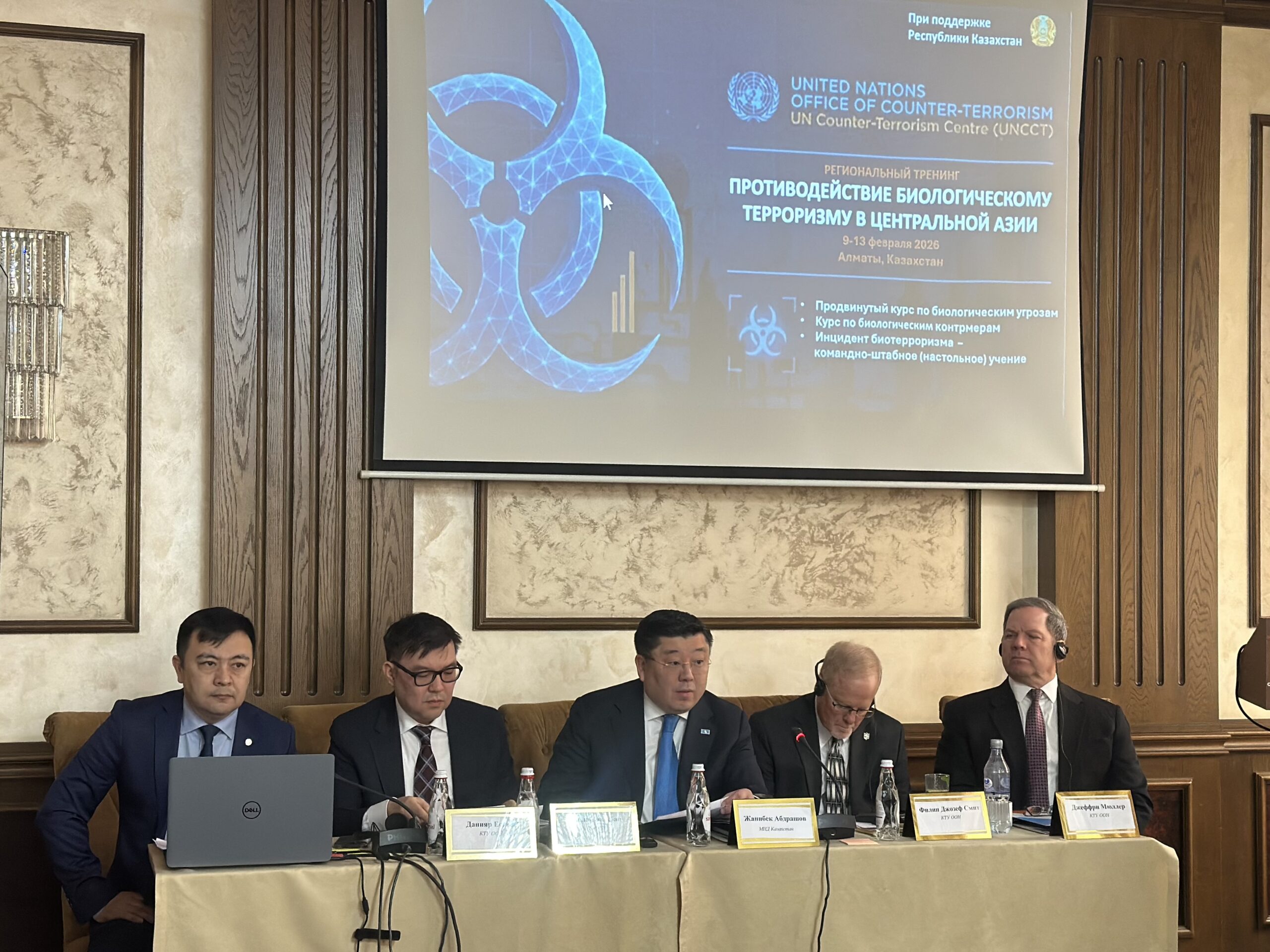 2026 жылғы 9 ақпанда Қазақстан Республикасы Сыртқы істер министрлігінің Ерекше тапсырмалар жөніндегі елшісі – Алматы қаласындағы ҚР СІМ Өкілдік басшысы Жәнібек Әбдрашов Орталық Азиядағы биологиялық терроризмге қарсы іс-қимыл жөніндегі өңірлік оқыту тренингіне қатысып, сөз сөйледі.