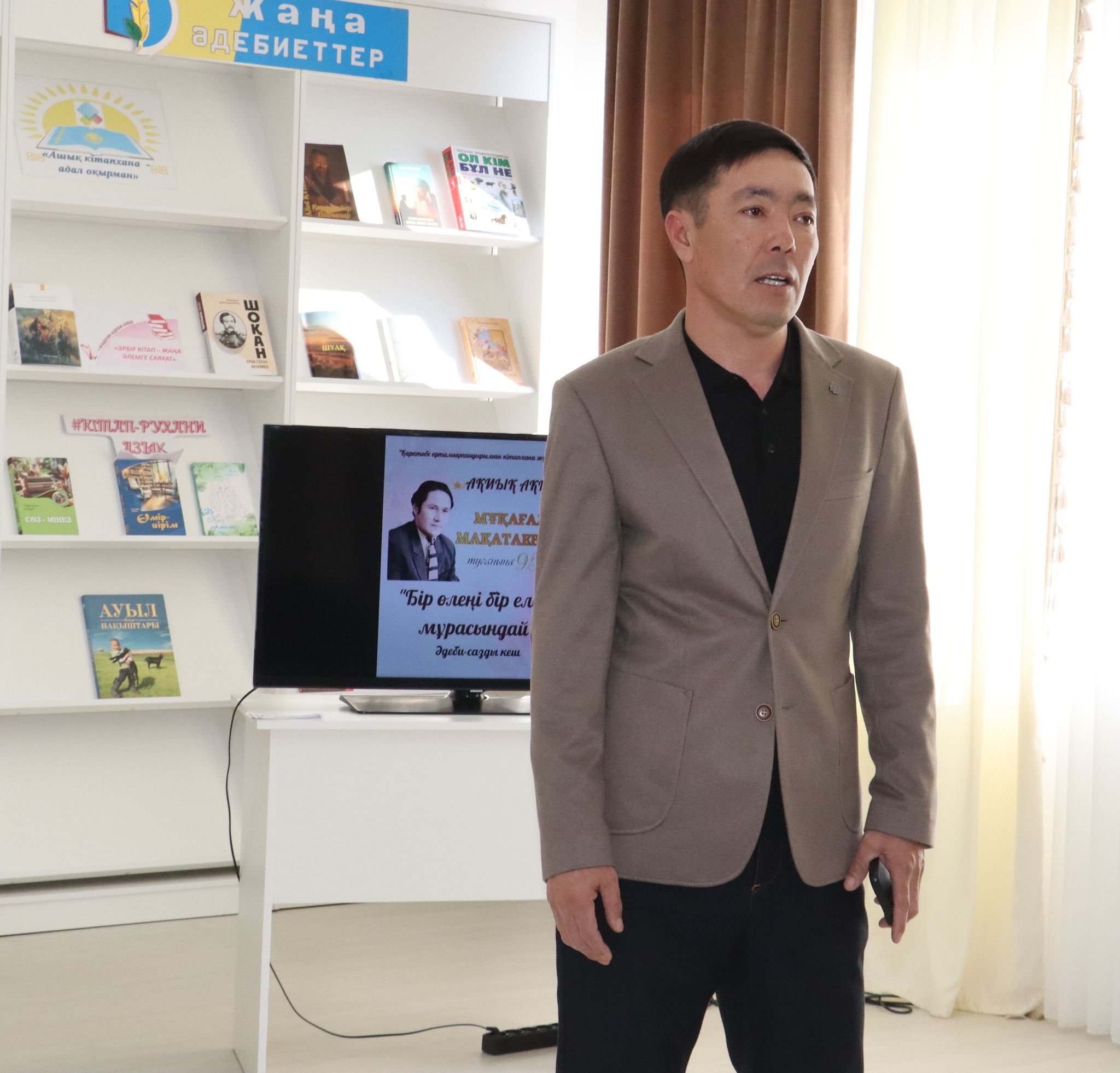 Ақынға арналған әдеби сазды кешті аудандық орталықтандырылған кітапхана жүйесінің окырмандарды қамту бөлімінің кітапханашысы Айнагүл Құрманова жүргізді.