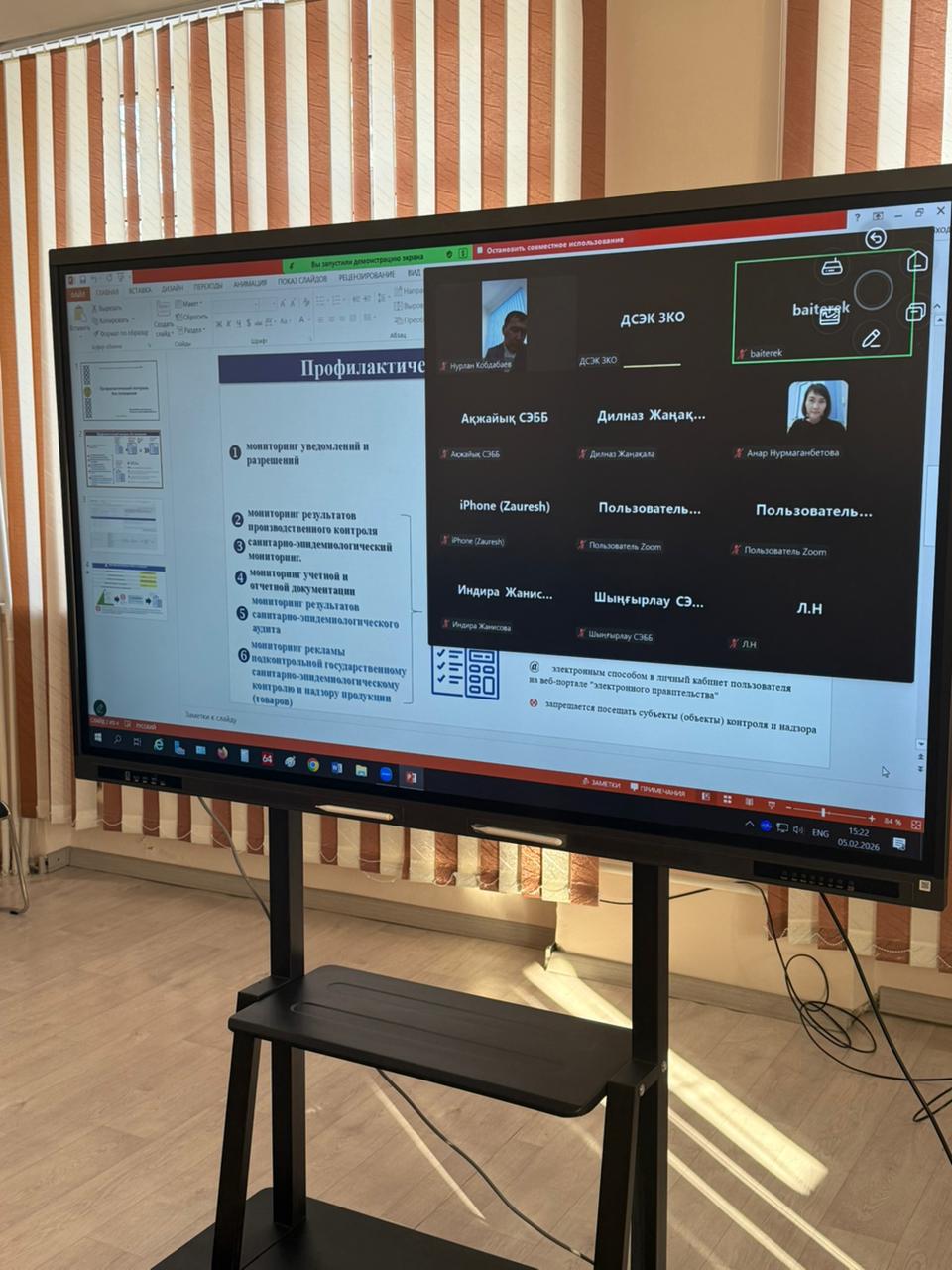 Батыс Қазақстан облысы санитариялық-эпидемиологиялық бақылау департаментінің құқықтық қамтамасыз ету бөлімінің басшысы А.С. Баймуханбетова Батыс Қазақстан облысы санитариялық-эпидемиологиялық бақылау департаментінін және оның аумақтық басқармаларының мамандарына бармай профилактикалық бақылау және оның шаралары бойынша құқықтық оқыту өткізді.