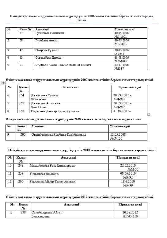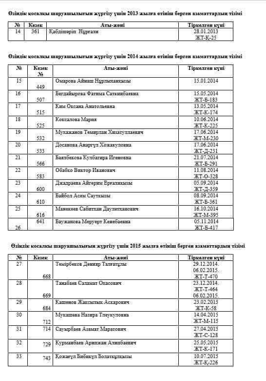 Согласно нижеуказанным спискам, просим вас явиться в аппарат акима Толебийского сельского округа для оформления земельных документов.