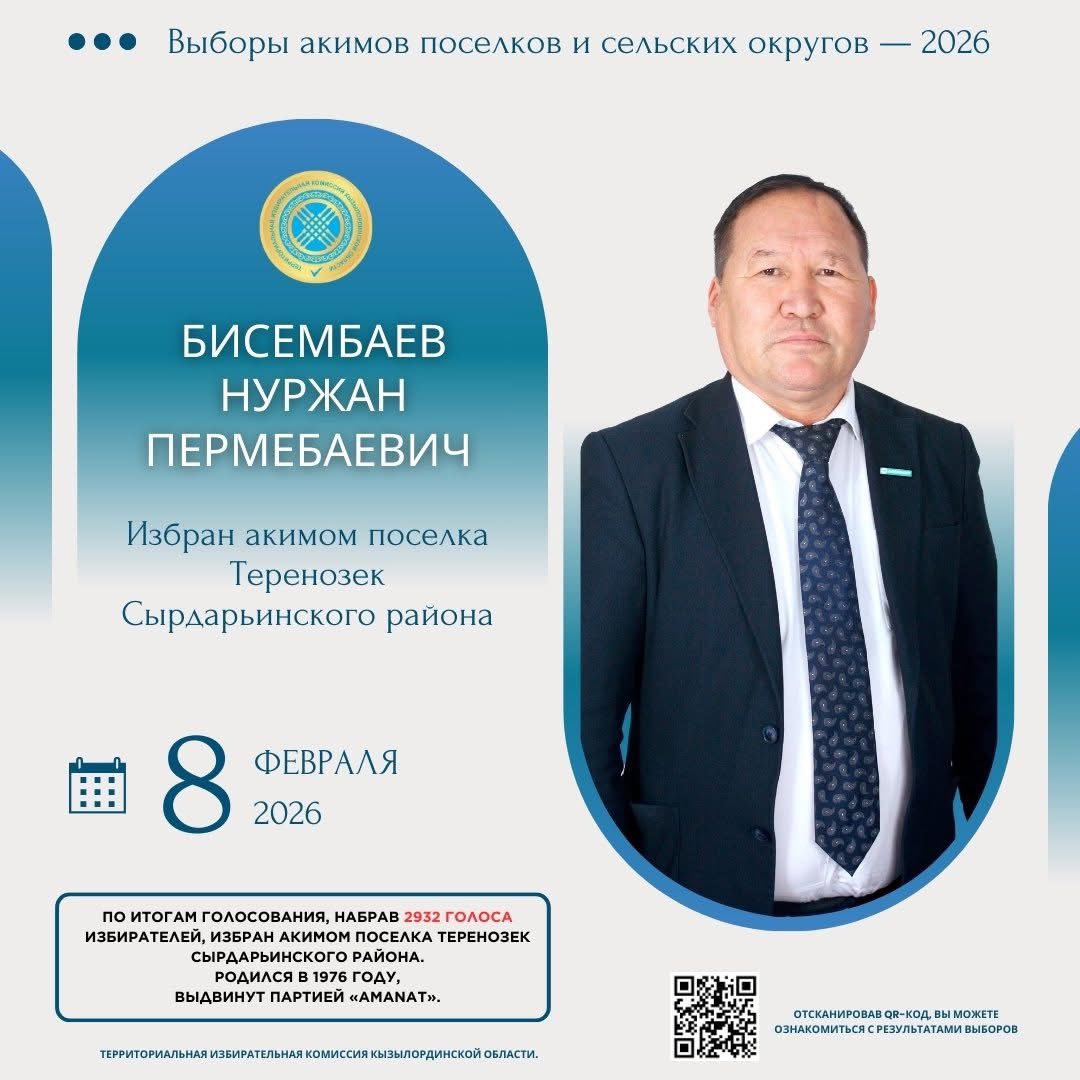 2932 дауысын жинап, Сырдария ауданы Тереңөзек кентінің әкімі ретінде сайланды.