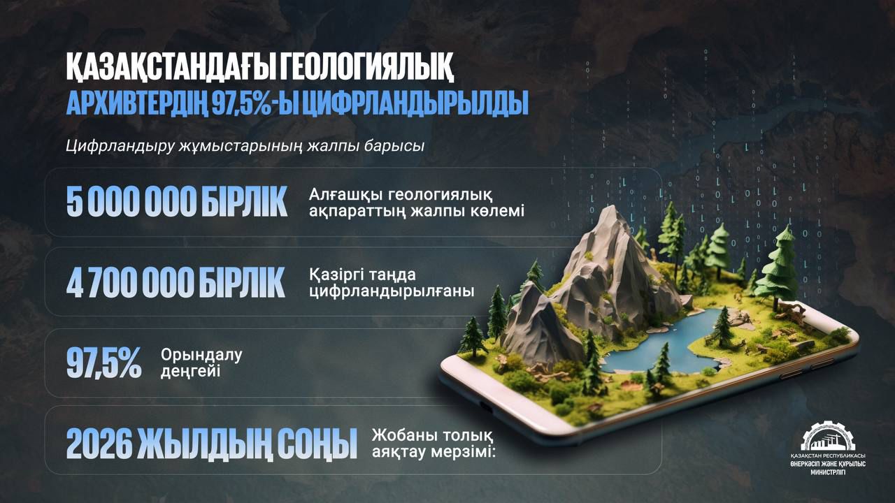 Геологиялық ақпаратты цифрландырудың (сканерлеудің) толық циклі 2026 жылдың соңына дейін аяқталады деп жоспарлануда. Нәтижесінде архивтік материалдардың 100 пайыздық қамтылуы қамтамасыз етіледі.