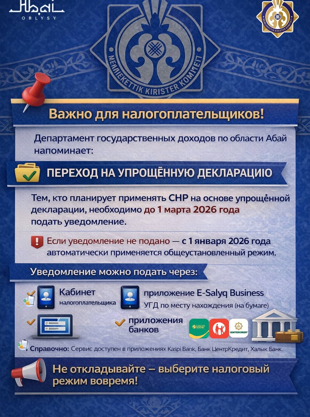 Абай облысы бойынша Мемлекеттік кірістер департаменті салық төлеушілерді салық режимін уақытылы таңдауға және белгіленген мерзімді өткізіп алмауға шақырады.