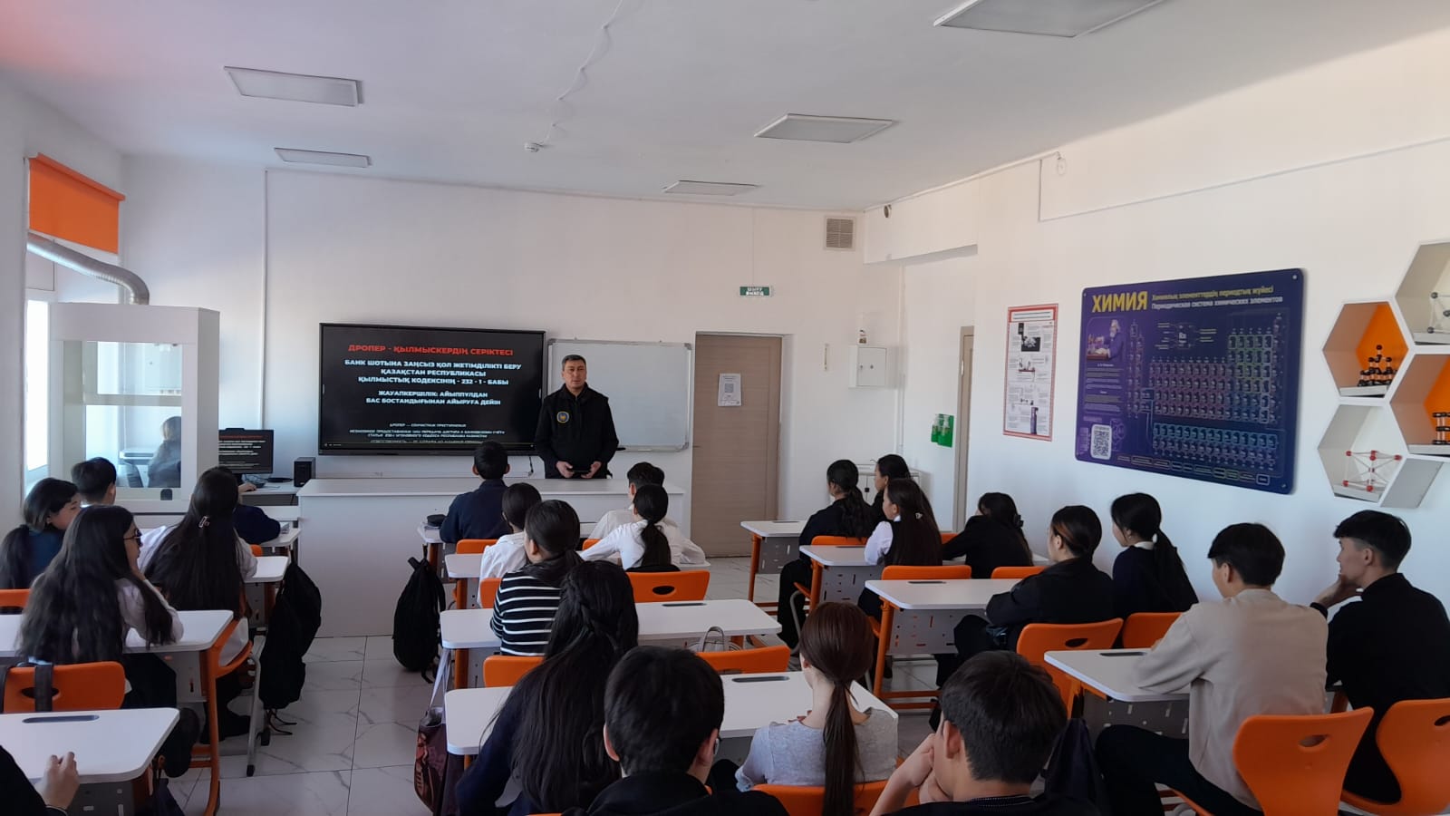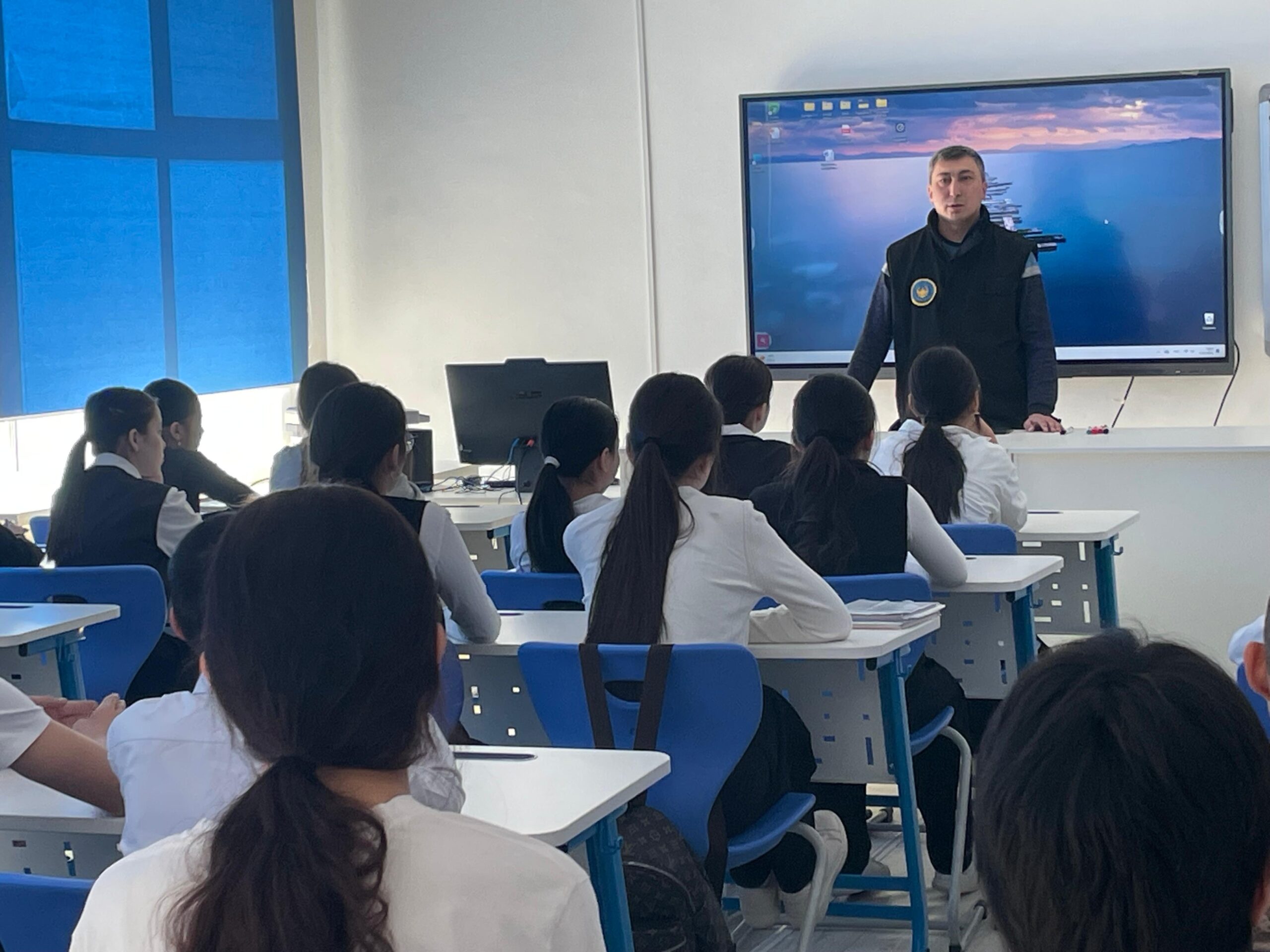 Полиция қызметкерлері оқушыларға құқыққа қарсы әрекеттердің құқықтық салдарын түсіндіріп, тәжірибеден нақты мысалдар келтірді және заң талаптарын сақтау мен цифрлық сауаттылықтың маңыздылығын еске салды.