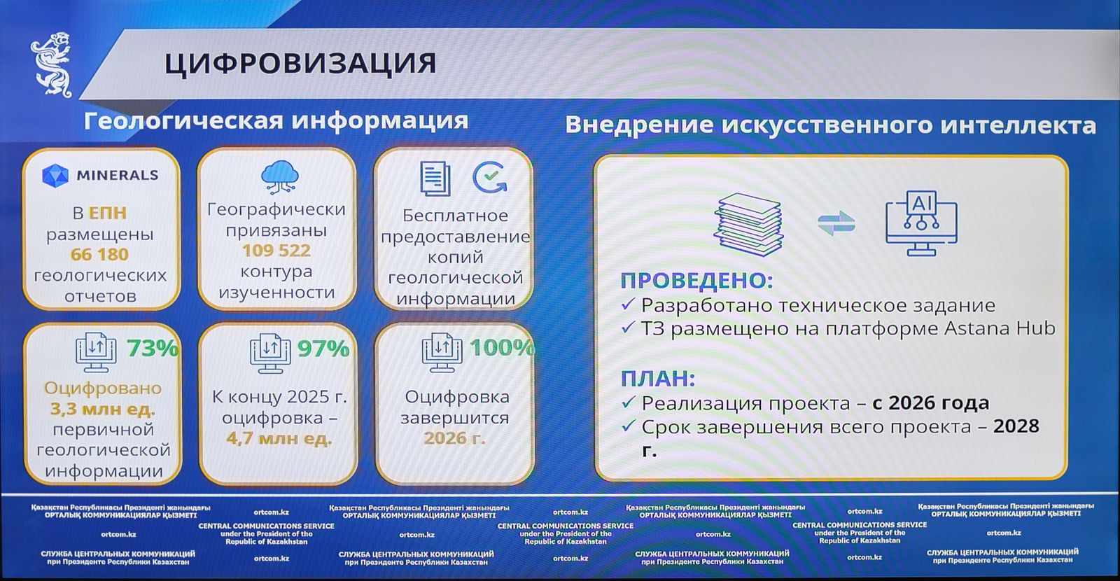 Салада цифрландыру үдерісі қарқынды жүргізілуде. Бірыңғай жер қойнауын пайдалану платформасы арқылы 22 мемлекеттік қызмет көрсетіледі, 66 мыңнан астам геологиялық есепке қолжетімділік қамтамасыз етілген. Бастапқы геологиялық ақпараттың 97,5%-ы цифрлық форматқа көшірілді, бұл жұмыс 2026 жылы толық аяқталады.