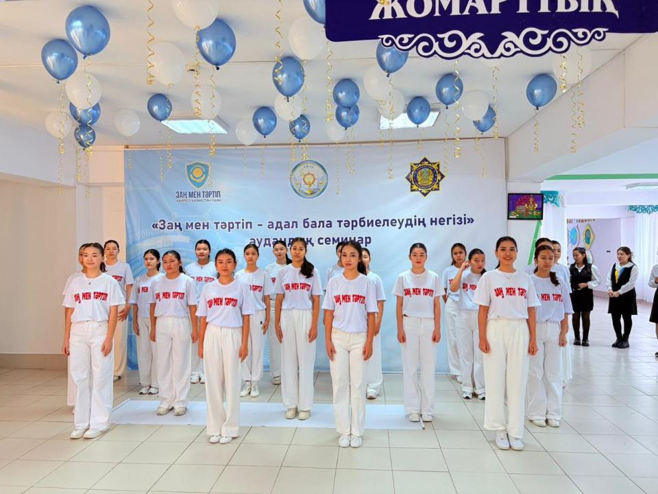 Аудандағы білім беру ұйымдарында оқушылар арасында құқықтық сауаттылықты арттыру, құқық бұзушылықтың алдын алу және заңға құрметпен қарау мәдениетін қалыптастыру мақсатында «Заң мен тәртіп» айлығы ұйымдастырылды. Бір айлық іс-шара «Заң мен тәртіп – адал бала тәрбиелеудің негізі» атты аудандық семинармен қорытындыланды.