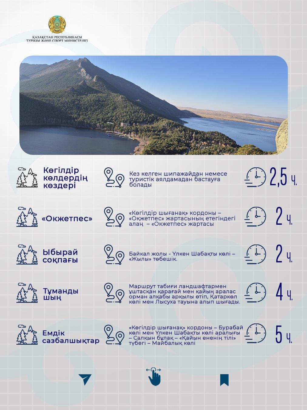 Бағыттардың толық сипаттамасы, келу ережелері және өзекті ақпаратты «Бурабай» мемлекеттік ұлттық табиғи паркінің ресми парақшасынан табуға болады.