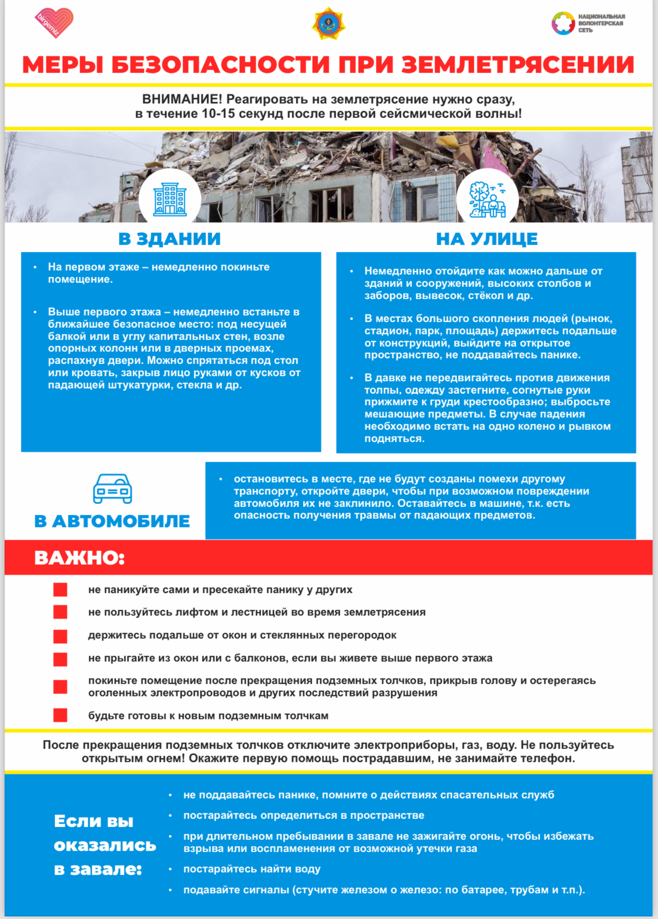– көп қабатты үйлерде жер сілкіс аяқталған соң ғимараттан шығыңыз;