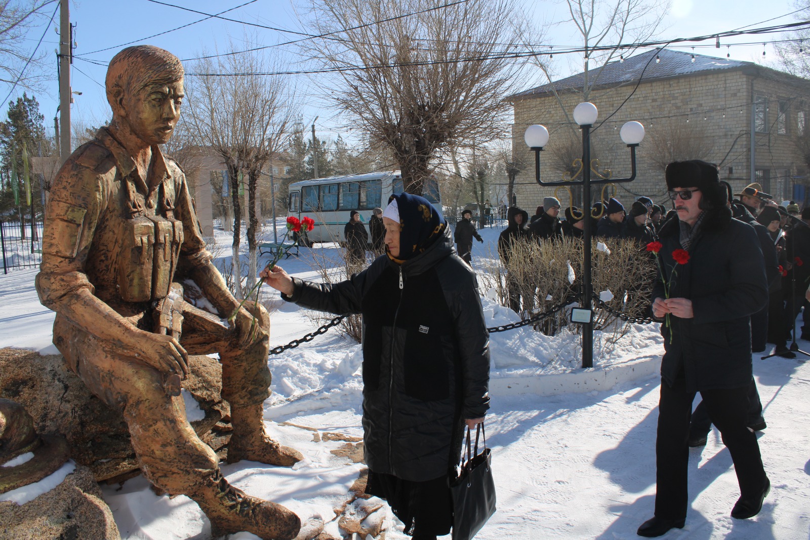 Одан кейін орталық саябақтағы Ауған соғысында қаза тапқан жерлес сарбаздарға арналған ескерткішке гүл шоқтарын қойып, Жамалиден Әлібаев, Асқар Быхин, Нағашыбай Жақтыбаев, Өміртай Құлтабаровтың рухтарына тағзым жасау рәсімі өтті.